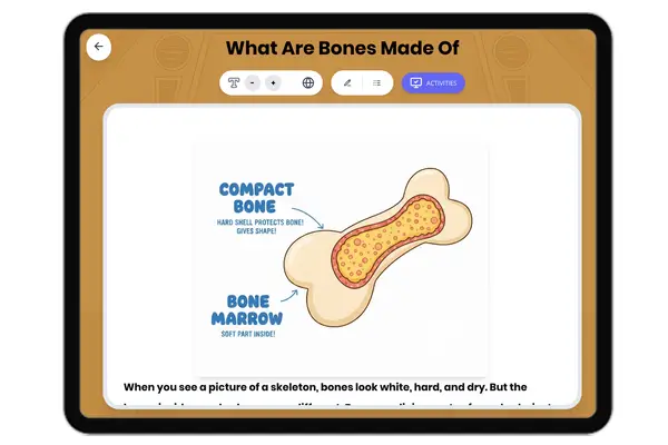 This engaging 250-word reading passage helps Grade 4 students understand how bones protect organs, aligned with NGSS standard 4-LS1-1 and the Disciplinary Core Idea LS1.A: Structure and Function. Students explore how the skull acts like a helmet to protect the brain, the rib cage serves as a shield around the heart and lungs, and the spine protects the spinal cord. The passage uses age-appropriate language and relatable analogies to help fourth graders connect the shape of each bone group to what it protects. This audio-integrated resource includes a simplified differentiated version for struggling readers, complete Spanish translations of both passages, a comprehensive glossary of key terms, multiple-choice comprehension questions, writing activities, and graphic organizers. Students learn why bones are essential for protecting soft organs from damage and understand the relationship between bone structure and function. Perfect for introducing skeletal system concepts, this passage builds foundational understanding that prepares students for hands-on investigations and classroom discussions about human body systems and how organisms are structured to support survival and growth.