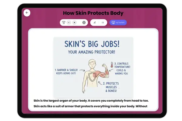 This audio-integrated reading passage introduces fourth-grade students to the protective functions of skin, aligned with...