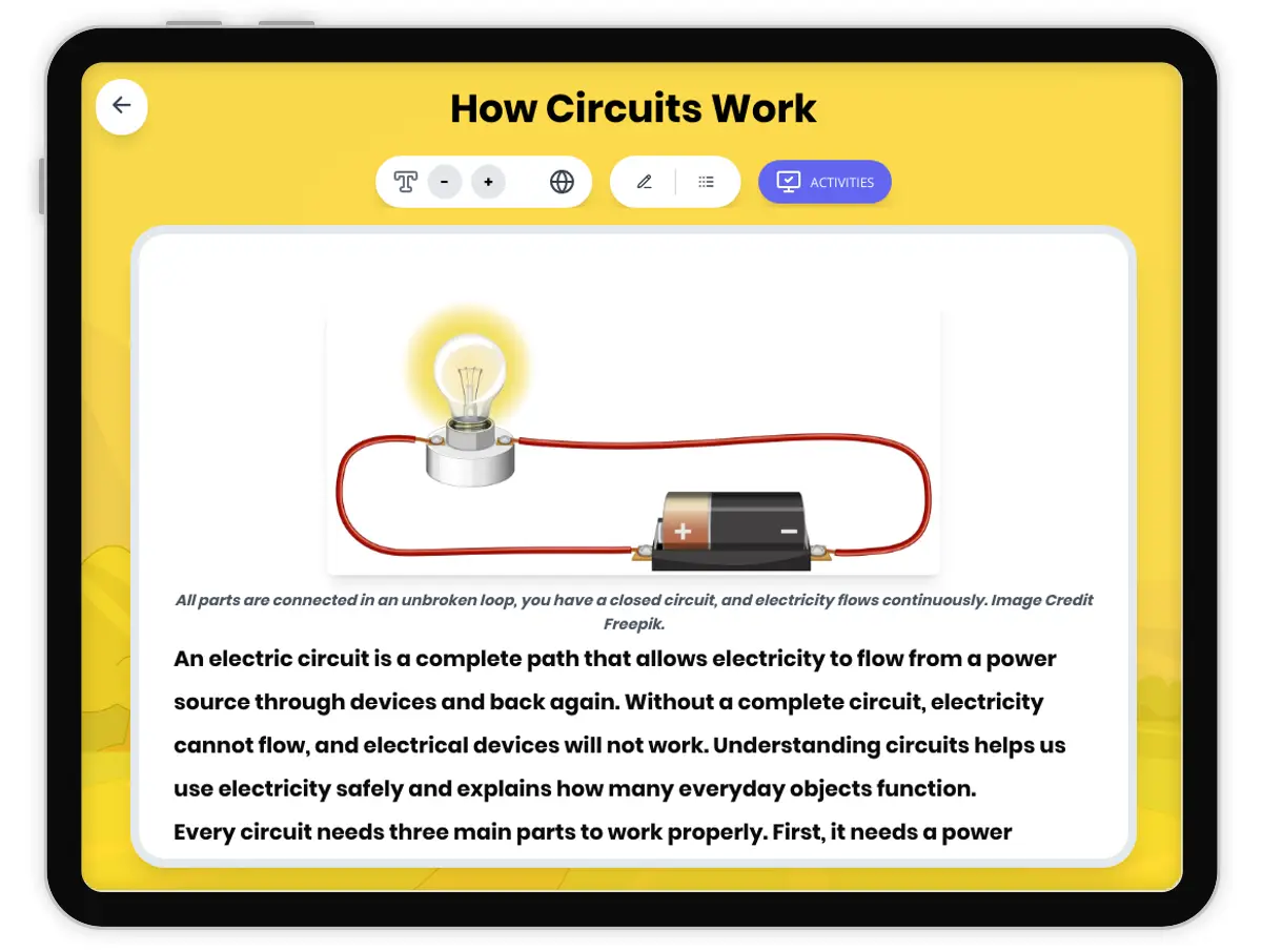 This 250-word informational reading passage introduces Grade 4-5 students to the fundamental concepts of electric circuits. Aligned with NGSS standard 4-PS3-2, the passage explains how electric circuits are complete paths that allow electric current to flow from an energy source through devices and back. Students learn about the essential components of a circuit: a power source like a battery, wires that carry electricity, and a load such as a light bulb. The passage uses the familiar example of a flashlight to demonstrate how circuits need an unbroken loop to function properly. Through clear explanations and concrete examples, students discover why switches are important for controlling the flow of electricity and what happens when a circuit is broken. The content includes audio integration for enhanced accessibility and engagement. Key vocabulary terms like circuit, current, power source, load, and switch are defined naturally within the text. The passage connects abstract electrical concepts to everyday experiences, helping students understand the science behind devices they use daily. Supplementary activities include multiple-choice questions, writing prompts, and graphic organizers that reinforce comprehension and application of circuit concepts.