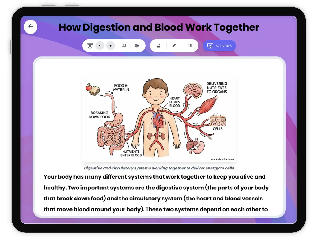 This 250-word reading passage introduces fourth-grade students to the relationship between the digestive system and circulatory system, aligned with NGSS standard 4-LS1-1. Students discover how nutrients from food pass from the digestive system into the blood, and how the heart pumps nutrient-rich blood to every cell in the body. The passage uses simple, age-appropriate language to explain this key example of body systems working together. Audio-integrated features support diverse learners by providing text-to-speech functionality. The passage includes bolded vocabulary terms with immediate definitions, real-world examples, and an engaging fact about the digestive process. Supplementary activities include comprehension questions testing recall and application, writing prompts requiring explanation and connection-making, and graphic organizers that help students visualize the sequence of nutrient delivery and the structure-function relationships of body systems. A simplified differentiated version ensures accessibility for students reading below grade level. Spanish translations of both passages support English language learners. This comprehensive resource builds foundational understanding of how body systems interact, preparing students for hands-on investigations and deeper exploration of human body functions.