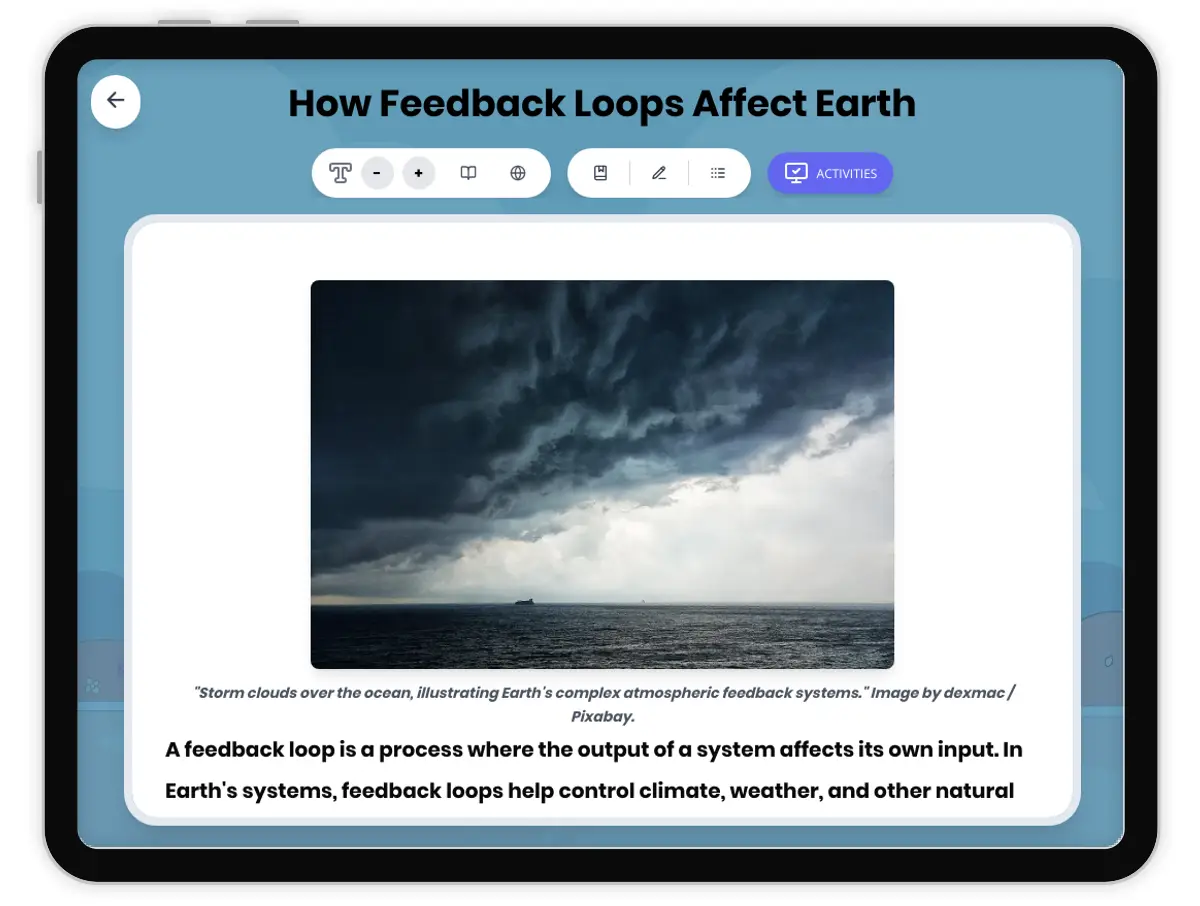 This comprehensive middle school science reading passage explores how feedback loops affect Earth's systems. Students will understand the difference between positive and negative feedback loops through clear explanations and real-world examples. The passage covers ice-albedo feedback as a positive feedback loop and the water cycle as a negative feedback loop. Aligned with NGSS MS-ESS2-1, this resource includes audio-integrated content for enhanced accessibility. The passage is designed for grades 6-8 with appropriate vocabulary and readability levels. Students will analyze how feedback loops either amplify or stabilize changes in Earth's systems. The curriculum includes differentiated versions for English Language Learners, Spanish translations, comprehension activities, writing prompts, and graphic organizers. These audio-integrated materials help students develop scientific thinking skills while exploring Earth's interconnected systems and the processes that regulate our planet's climate and weather patterns.
