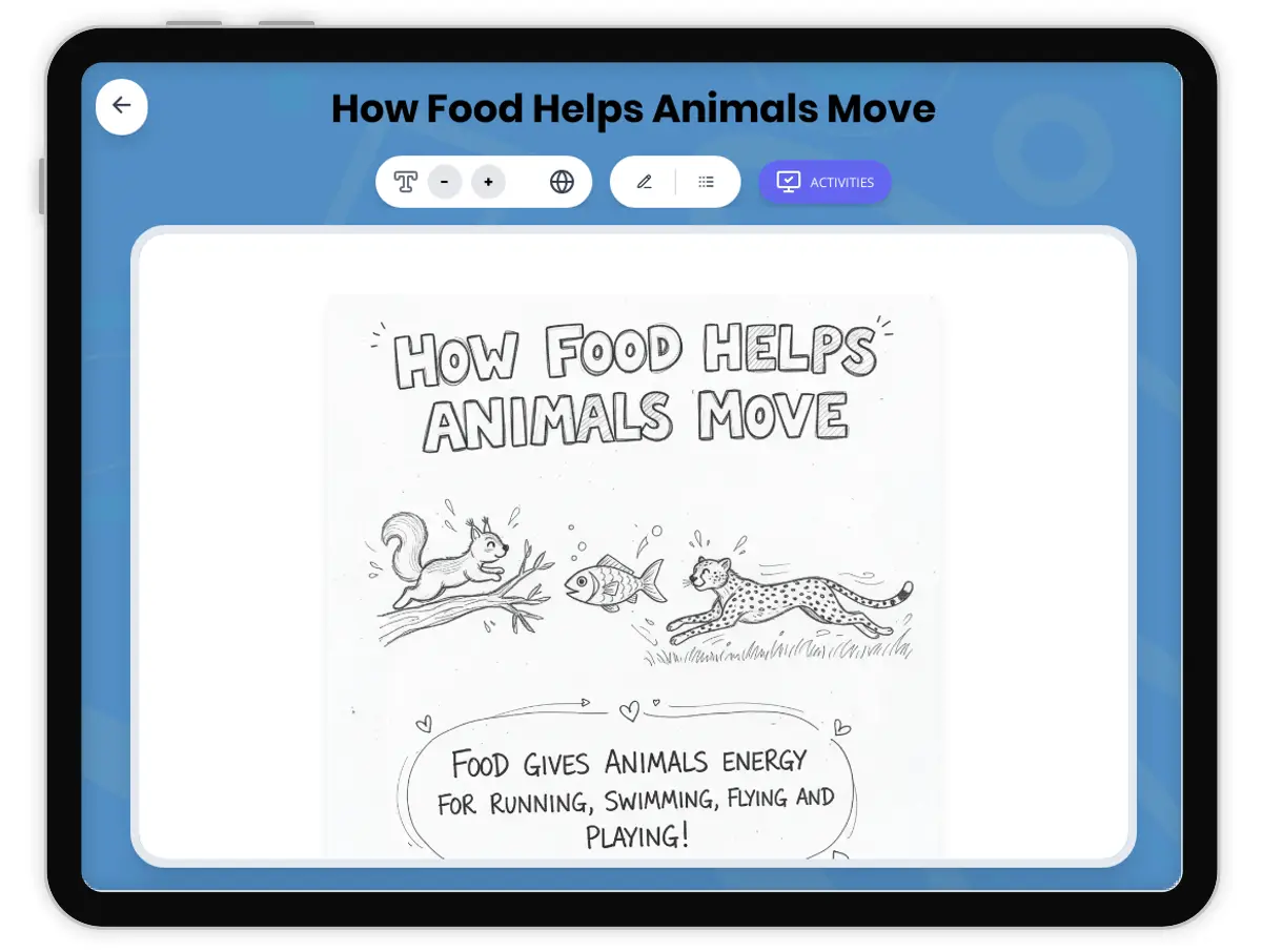 This 5th grade science reading passage explores how food helps animals move, directly aligned to NGSS standards 5-LS1-1 and 5-PS3-1. Students discover how muscles use energy from food to power every type of movement, from running and swimming to breathing and heartbeat. The passage uses relatable analogies, such as comparing food energy to fuel in a car, to help students understand this fundamental biological concept. Through clear explanations and real-world examples, learners explore why more active animals need more food energy. The resource includes audio-integrated reading support, a simplified differentiated version for diverse learners, Spanish translations, vocabulary glossary, comprehension quizzes, writing activities, and graphic organizers. Perfect for introducing energy transfer and motion concepts in life science units.
