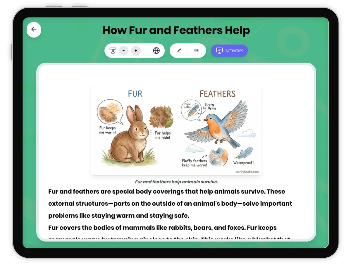 This 250-word informational reading passage introduces Grade 4 students to the important external structures of fur and feathers. Aligned with NGSS standard 4-LS1-1 and the Disciplinary Core Idea LS1.A, the passage explains how these structures help animals survive in their environments. Students discover how fur keeps mammals warm by trapping air close to the body and provides camouflage for protection. The passage also describes how feathers keep birds warm and dry, and how specially shaped flight feathers enable birds to fly. Students learn that some animals change their fur or feather color with the seasons for better camouflage. The content emphasizes both protection and temperature regulation functions. Written at a Grade 4 reading level, this passage uses simple sentences and everyday vocabulary to build foundational understanding. Audio-integrated features support diverse learners. The passage includes bold key terms with immediate definitions, real-world examples, and an interesting fact to engage young scientists. Accompanying activities include comprehension questions, writing prompts, and graphic organizers to reinforce learning about animal structures and their functions.