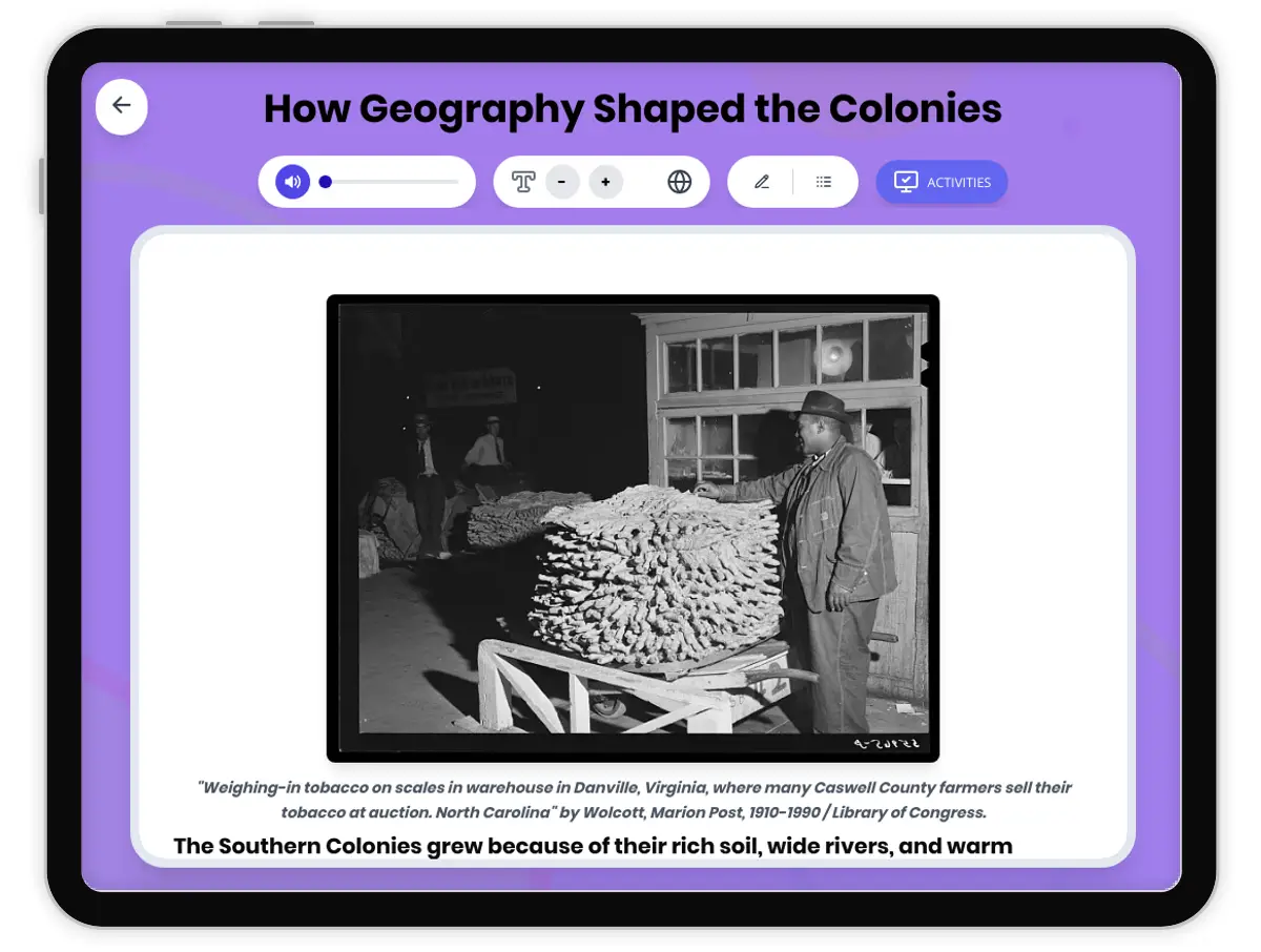 This engaging history reading passage explores how geography shaped the development of the Southern Colonies in Colonial America. Students will learn about the importance of the land, rivers, and climate in the growth of colonies like Virginia, Maryland, North Carolina, South Carolina, and Georgia. The passage highlights the cause-and-effect relationship between geography and daily colonial life, including farming, trade, and settlement patterns. It introduces key vocabulary words, provides a timeline of important events, and encourages students to analyze how people adapted to their environment. Activities include a multiple-choice quiz, writing prompts, a glossary, and graphic organizers to deepen understanding. This resource is aligned with C3 Framework (D2.His.2.3-5, D2.Geo.3.3-5) and Common Core standards (RI.4.3, RI.4.4, W.4.2). It includes a Spanish translation and read aloud audio, making it ideal for diverse learners seeking to build foundational literacy and history skills.