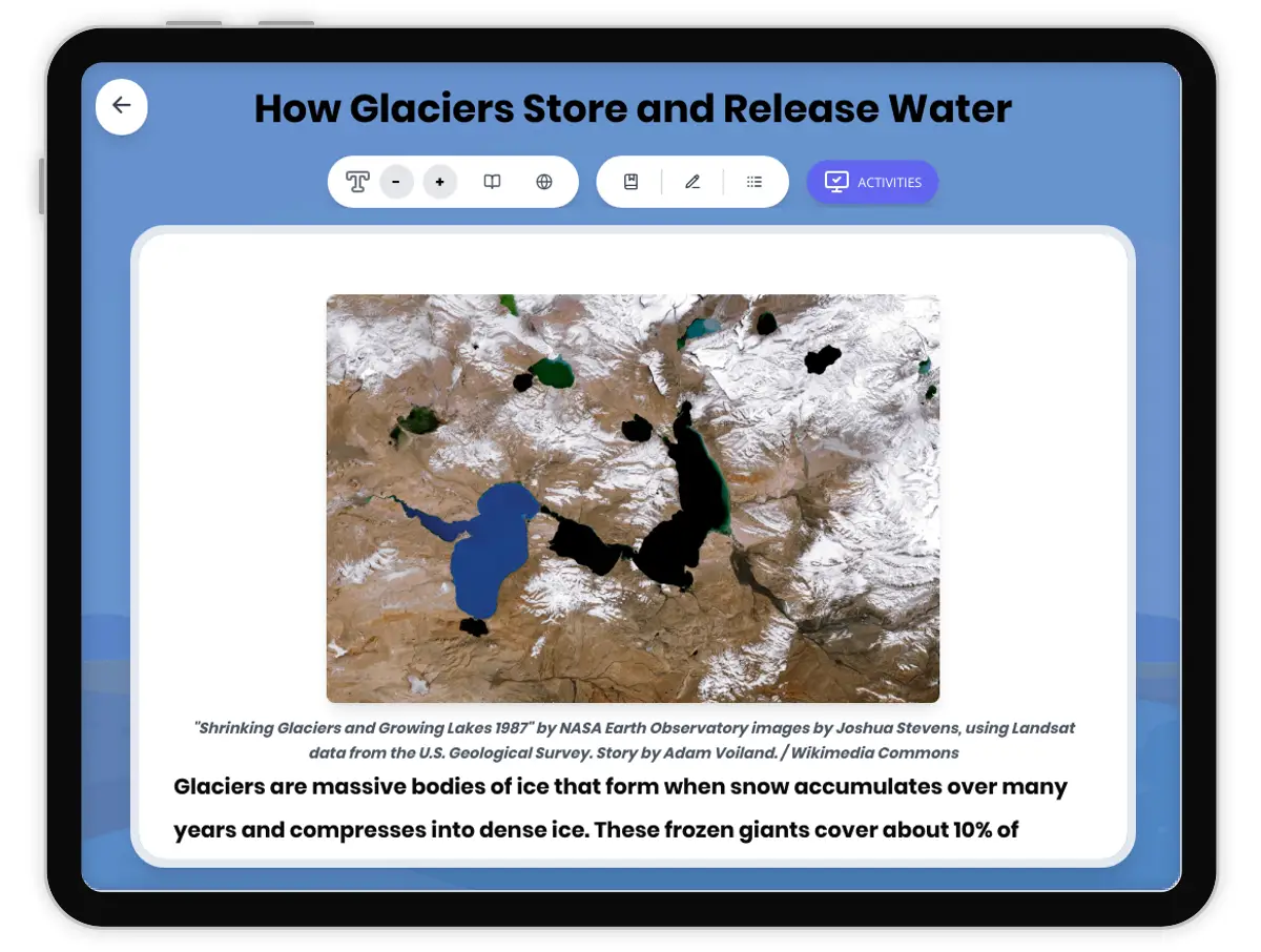 This comprehensive middle school science passage examines how glaciers store and release water, aligned with NGSS MS-ESS2-4 standards. Students explore glaciers as major freshwater reservoirs locked in solid form, containing approximately 69% of Earth's freshwater. The passage explains the processes of melting and calving through which glaciers release water into rivers and oceans. Real-world examples connect glacier retreat to regional water availability, helping students understand the broader distribution of Earth's freshwater resources. Audio-integrated features support diverse learners, while differentiated versions ensure accessibility for all students. Activities include comprehension questions, writing prompts, and graphic organizers that reinforce understanding of glacier dynamics and their critical role in Earth's water cycle and human communities.