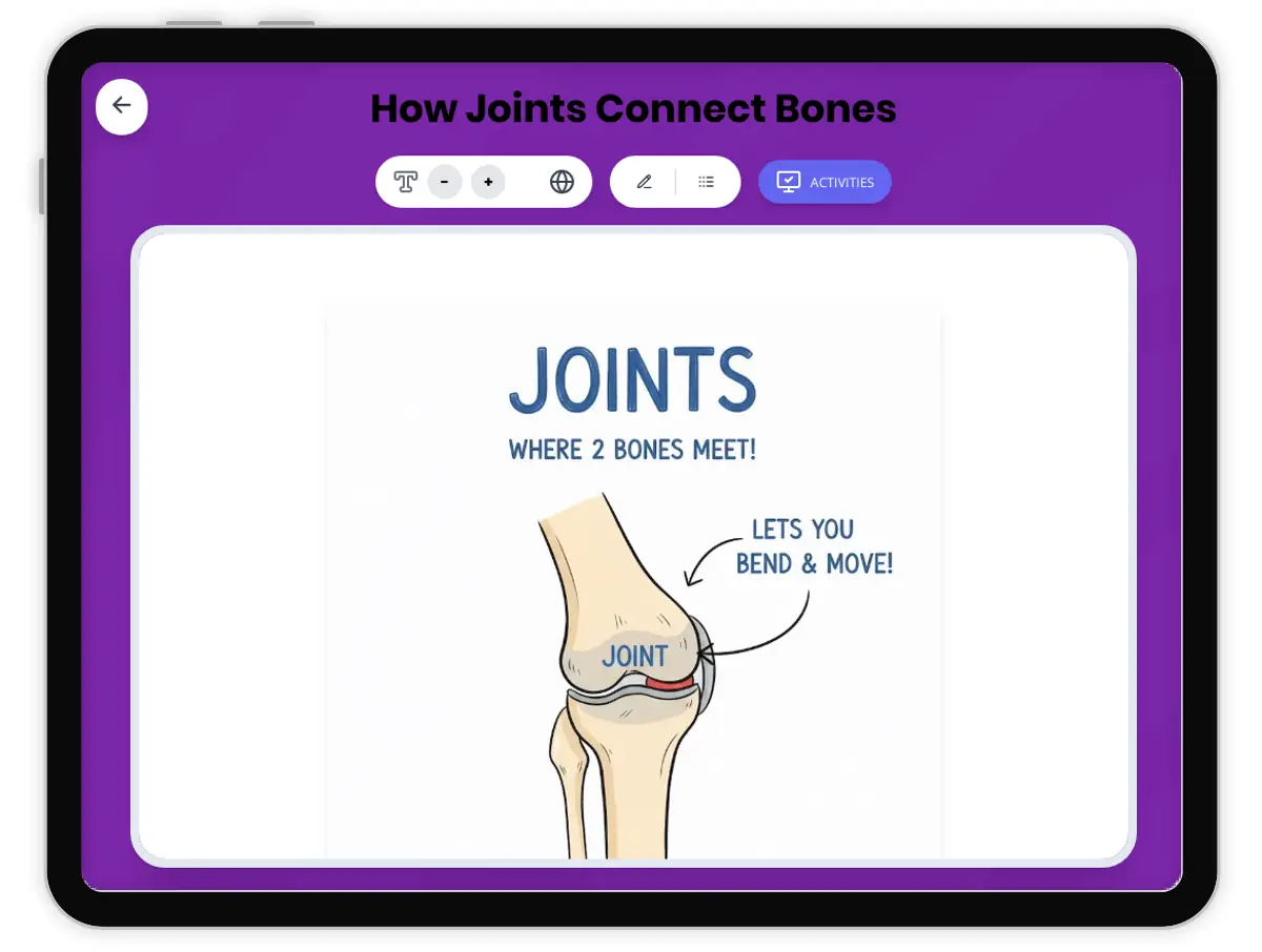 This 250-word reading passage teaches fourth-grade students about joints and their role in the human skeletal system. Aligned with NGSS 4-LS1-1 and Disciplinary Core Idea LS1.A, the passage explains that joints are the places where two bones meet and allow the body to bend and move. Students explore real-world examples including knee joints, elbow joints, and shoulder joints to understand how different joints enable different types of movement. The passage uses simple, age-appropriate language and concrete examples that fourth graders can relate to, such as bending knees and swinging arms. Audio integration supports diverse learners by providing text-to-speech functionality. Accompanying activities include multiple-choice comprehension questions, writing prompts that ask students to explain and apply their understanding, and graphic organizers that help students organize information about joint structure and function. The simplified differentiated version provides the same core science content with shorter sentences and scaffolded support for students reading below grade level. Spanish translations of both versions ensure accessibility for English language learners. This comprehensive resource builds foundational understanding of how the skeletal system supports body movement.