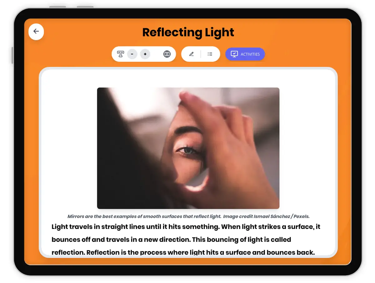 This engaging science passage explores the concept of light reflection for Grade 4-5 students, aligned with NGSS standard 4-PS4-2. Students learn how reflection happens when light bounces off surfaces and travels in new directions following predictable rules. The passage explains why smooth, shiny surfaces like mirrors reflect light evenly to create clear images, while rough surfaces scatter light in many directions. Through relatable examples and concrete analogies, students discover how we see our reflections in mirrors because light bounces off the mirror surface and enters our eyes. The passage includes real-world applications of reflection in everyday life, from bathroom mirrors to safety reflectors. Audio-integrated features support diverse learners, while differentiated versions ensure accessibility for all reading levels. Key vocabulary terms are bolded and defined in context, with a comprehensive glossary provided. Students explore reflection, light bouncing, mirrors, smooth surfaces, and reflected light through multiple activities including comprehension questions, writing prompts, and graphic organizers that reinforce understanding of this fundamental physics concept.