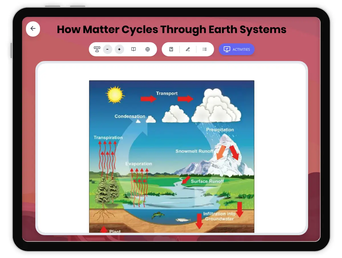 This comprehensive reading passage explores how matter cycles through Earth's four spheres: atmosphere, hydrosphere, geosphere, and biosphere. Aligned with NGSS standard MS-ESS2-1, students discover how water, carbon, and nitrogen continuously move through Earth's systems without being created or destroyed. The passage uses clear, grade-appropriate language to explain complex scientific concepts including evaporation, condensation, photosynthesis, respiration, and decomposition. Real-world examples help students understand how these cycles work together to maintain life on Earth. The audio-integrated passage includes a simplified version for struggling readers, Spanish translations, comprehensive glossary, multiple-choice questions, writing activities, and graphic organizers. Students engage with cause-and-effect relationships and process sequences to deepen their understanding of Earth's interconnected systems and the law of conservation of matter.