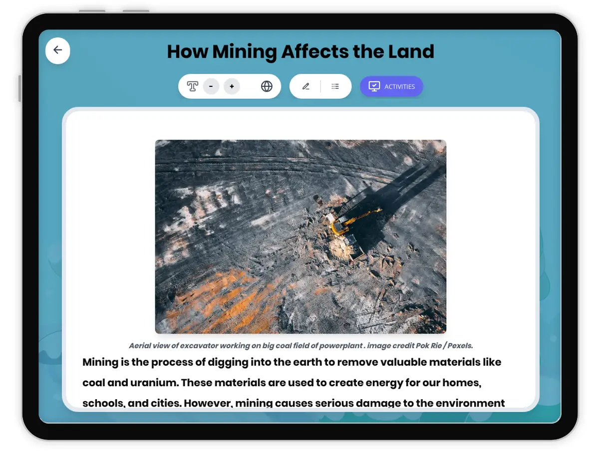This comprehensive 250-word reading passage helps Grade 4-5 students understand the environmental impacts of mining operations. Aligned with NGSS 4-ESS3-1, the passage explains how mining for coal and uranium damages land by removing soil and rock, creating large pits and waste rock piles. Students learn about surface mining and how it destroys habitats, as well as underground mining's effects including land subsidence and water pollution. The content includes audio-integrated features for enhanced accessibility and engagement. Through concrete examples and clear cause-and-effect relationships, students discover how extracting fossil fuels dramatically changes landscapes. The passage uses age-appropriate vocabulary while introducing key scientific terms like surface mining, underground mining, habitat, and subsidence. Supplementary activities include multiple-choice questions testing recall and comprehension, writing prompts requiring students to explain mining impacts, and graphic organizers comparing mining types and analyzing cause-and-effect relationships. Spanish translations are provided for both the main and simplified passages, supporting English language learners. This resource helps students understand human impacts on Earth's systems and the environmental consequences of resource extraction, preparing them for more advanced environmental science concepts.