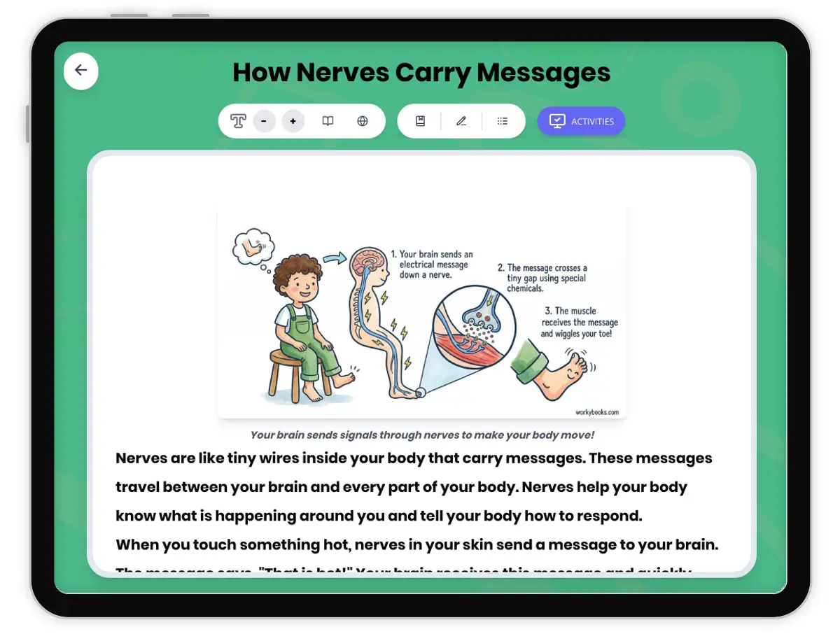 This engaging 250-word reading passage introduces fourth-grade students to the nervous system and how nerves carry messages throughout the body. Aligned with NGSS standard 4-LS1-2, the passage explains that nerves are like tiny wires connecting the brain to every part of the body. Students learn how nerves send messages incredibly fast—faster than you can think—when you touch something hot or need to move a muscle. The passage uses age-appropriate language and real-world examples to help students understand this foundational concept about how the body receives and processes information. Audio-integrated features support diverse learners, while the simplified differentiated version ensures accessibility for all reading levels. The passage includes bold key vocabulary terms with immediate definitions, a relatable analogy comparing nerves to wires, and an interesting fact about nerve message speed. Supplementary activities include comprehension questions testing recall and application, writing prompts requiring explanation and connection to real life, and graphic organizers that help students visualize the sequence of nerve messages and the structure-function relationship of the nervous system. Spanish translations of both passage versions support English language learners. This comprehensive resource builds foundational understanding of body systems necessary for hands-on investigations and deeper NGSS learning.