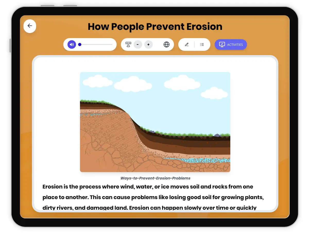 This Grade 4-5 science passage focuses on 'Ways to Prevent Erosion Problems' and aligns with NGSS standards. Students will discover how erosion affects the environment, why it is important to protect soil, and what methods people and nature use to stop erosion. Key scientific terms such as erosion, soil, roots, vegetation, mulch, and terrace are explained and bolded for clarity. The passage includes real-world examples and ends with an interesting science fact. The content is audio integrated and comes with a glossary, reading comprehension questions, writing activities, and a full Spanish translation. This resource helps students connect science to everyday life and supports vocabulary building, scientific thinking, and language development.