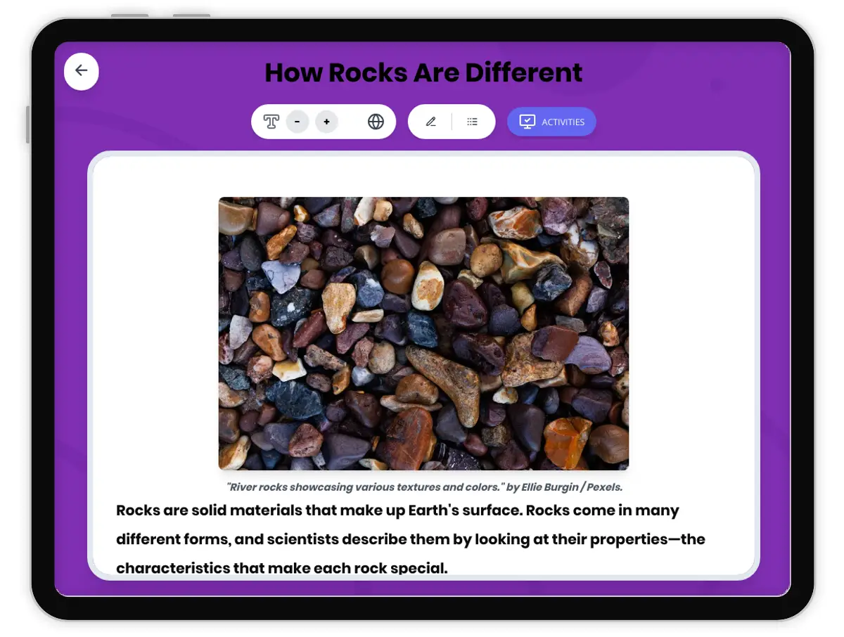 This 250-word reading passage introduces fourth-grade students to the observable properties of rocks, aligned with NGSS standard 4-ESS2-1 and DCI ESS2.A. Students learn that rocks come in many different forms and can be described by their hardness, texture, color, and structure. The passage explains how some rocks are hard while others are soft enough to scratch with a fingernail, how texture varies from rough and gritty to smooth, and how rocks display different structures including visible layers, crystals, and cemented pebbles. Students discover that rocks come in various colors including gray, red, white, black, and brown. The passage emphasizes that scientists and students can sort and compare rocks by testing hardness, observing texture, and noting color differences. Audio-integrated features support diverse learners. This foundational earth science content prepares students for hands-on rock classification activities and builds understanding of Earth's materials and their properties.