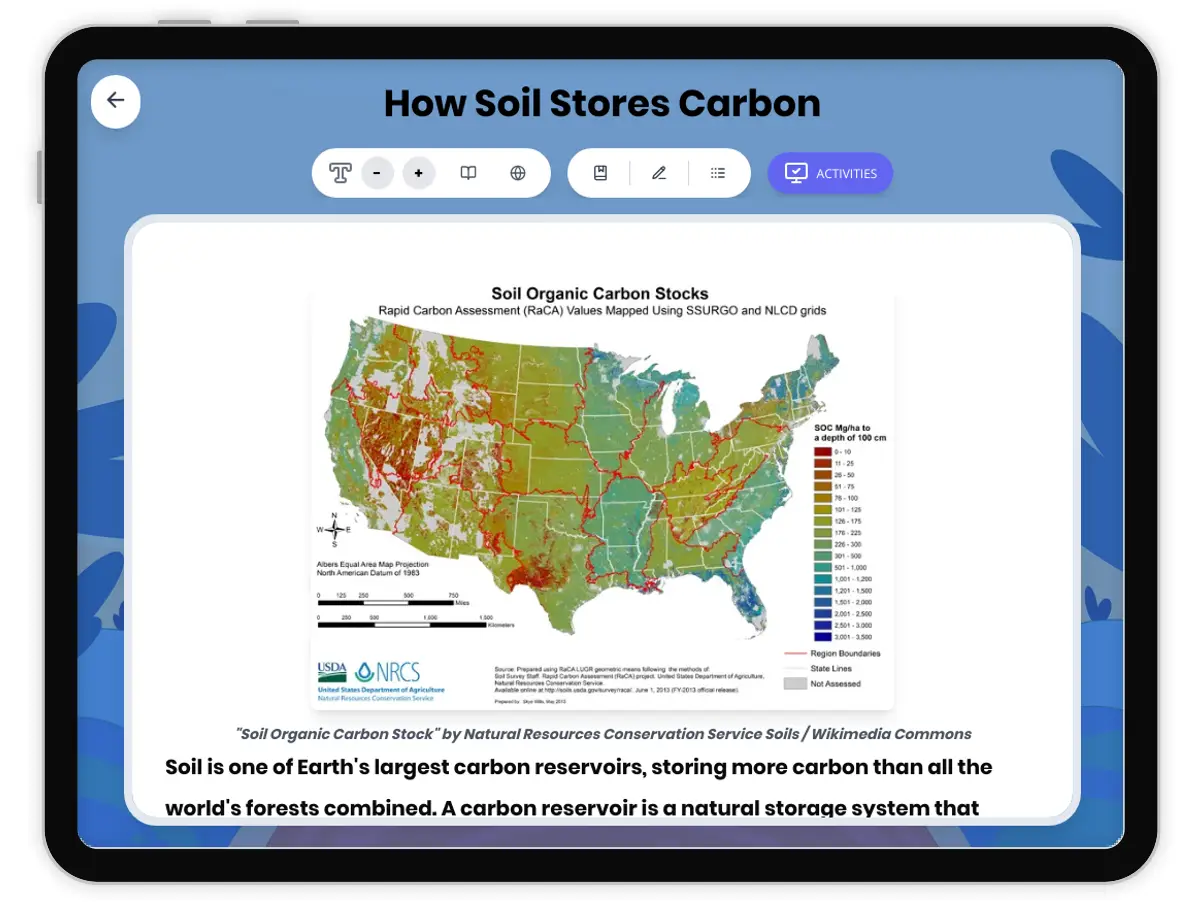 This comprehensive middle school science passage explores how soil stores carbon and its critical role in Earth's carbon cycle. Students learn about soil as a significant carbon reservoir, examining how decomposed organic matter accumulates as humus and peat, and how permafrost locks away large amounts of carbon. The passage connects soil carbon storage to the broader carbon cycle and explains why its release through warming or land disturbance matters for our climate. Aligned with NGSS standard MS-ESS2-1, this audio-integrated resource includes a grade-level passage, simplified differentiated version for struggling readers, Spanish translations, interactive comprehension activities, writing prompts with model answers, and graphic organizers. The content uses clear, accessible language appropriate for grades 6-8 while maintaining scientific accuracy. Students explore real-world connections between soil processes and climate change, developing understanding of Earth's systems and human impacts on the environment.