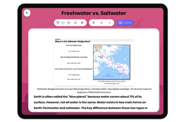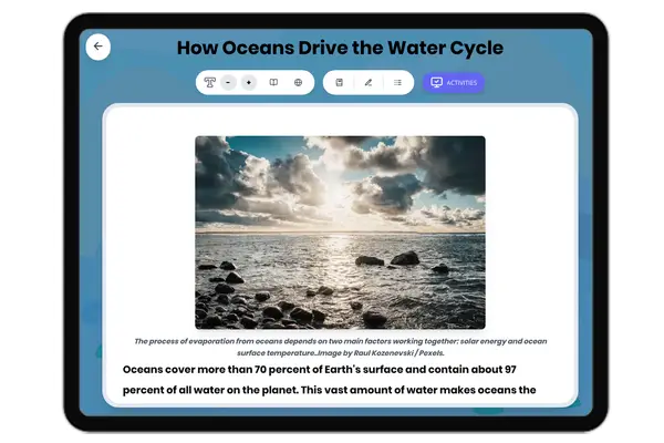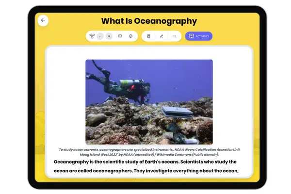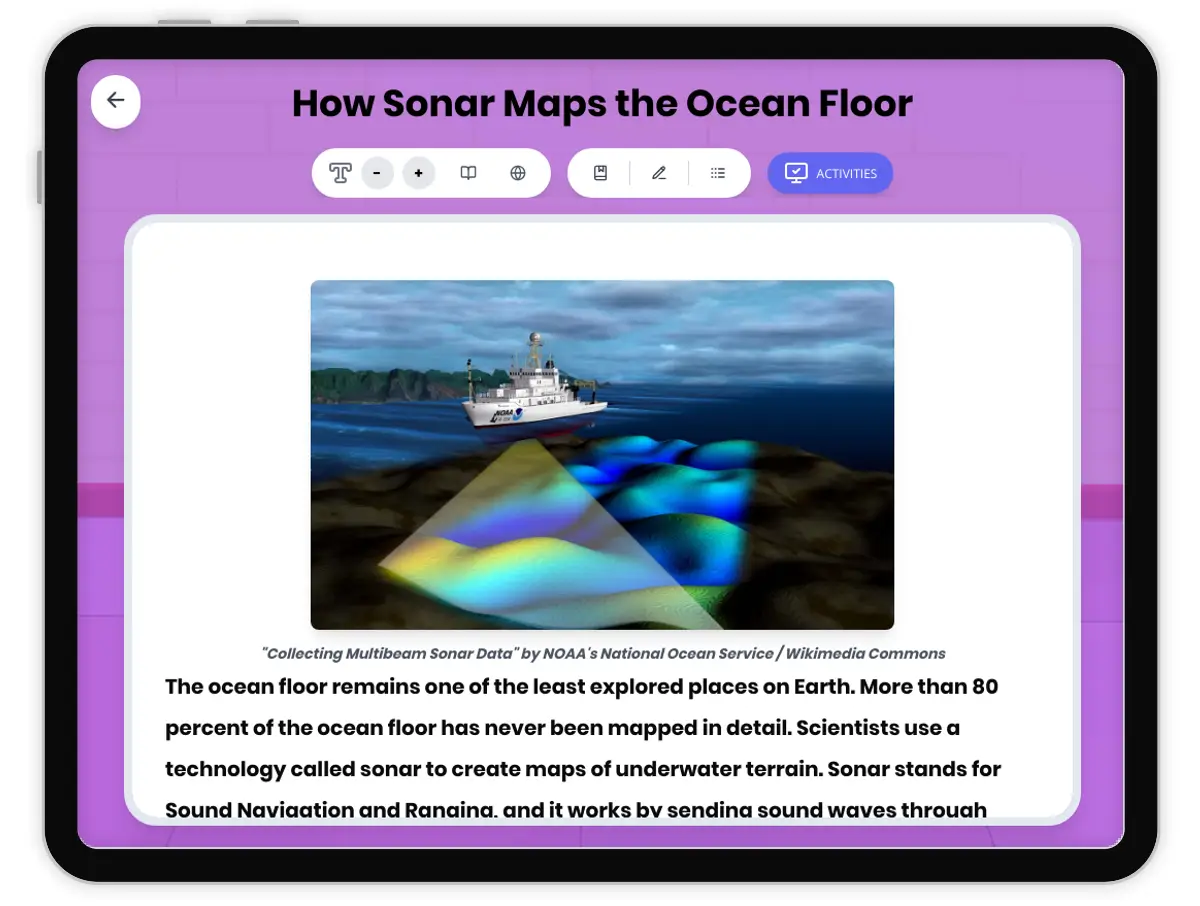 This comprehensive middle school science reading passage explores how sonar technology maps the ocean floor using sound waves. Students learn about the process of echolocation, bathymetry, and how sonar reveals underwater features like mid-ocean ridges and deep ocean trenches. The passage connects sonar mapping to the discovery of plate tectonic evidence and seafloor spreading, aligning with NGSS standard MS-ESS2-4. Audio-integrated content includes a grade-level passage, simplified differentiated version for struggling readers, Spanish translations, glossary of key scientific terms, multiple-choice comprehension questions, writing activities, and graphic organizers. Students explore how scientists use this technology to study Earth's least-known surface and gather evidence for the theory of plate tectonics. The materials support diverse learners through multiple formats and scaffolded activities that build understanding of how technology enables scientific discovery.
