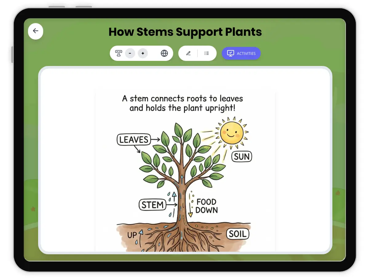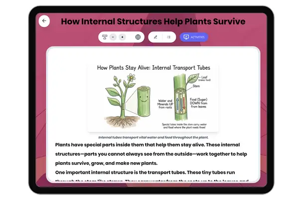 This engaging 250-word reading passage helps Grade 4 students understand how stems support plants and contribute to their survival. Aligned with NGSS 4-LS1-1 and the Disciplinary Core Idea LS1.A, the passage explains how stems hold plants upright, position leaves to receive sunlight, and create pathways between roots and leaves. Students explore different types of stems including thin flexible stems like daisies, thick woody stems like tree trunks, and climbing stems like vines. The passage uses age-appropriate language and real-world examples to build foundational understanding of plant structures and their functions. Audio-integrated features support diverse learners, while the simplified differentiated version ensures accessibility for all reading levels. Complementary activities include multiple-choice comprehension questions, writing prompts that encourage application of concepts, and graphic organizers that help students analyze stem structures and functions. This standards-aligned resource provides teachers with complete instructional materials for teaching plant anatomy and the relationship between structure and function in living organisms.
