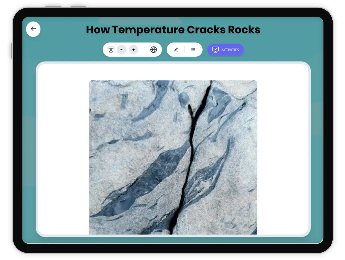 This engaging 350-word science passage introduces Grade 4-5 students to the concept of temperature weathering and how rocks crack through repeated heating and cooling cycles. Aligned with NGSS standard 4-ESS2-1, the passage explains how rocks expand when heated and contract when cooled, eventually causing cracks to form. Students explore real-world examples including desert rocks that experience extreme temperature changes between day and night, and campfire rocks that crack from rapid heating. The passage uses age-appropriate analogies and clear explanations to help students understand expanding, contracting, and temperature weathering. Audio-integrated features support diverse learners, while differentiated versions ensure accessibility for all reading levels. Comprehensive activities including multiple-choice questions, writing prompts, and graphic organizers reinforce understanding of this important Earth science concept. Students learn how this natural process shapes landscapes and contributes to soil formation over thousands of years.