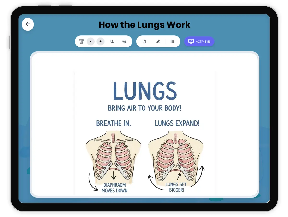 This audio-integrated reading passage teaches fourth grade students about the respiratory system and how the lungs function. Aligned with NGSS 4-LS1-1 and the Disciplinary Core Idea LS1.A: Structure and Function, the passage explains how lungs are spongy organs that bring oxygen into the body and remove carbon dioxide waste. Students learn the path air travels from the nose or mouth, through the windpipe, and into the lungs where oxygen enters the bloodstream. The passage also introduces the diaphragm, a muscle that helps control breathing through its up and down movement. Written at a Grade 4 reading level, this passage uses simple language and relatable examples to build foundational understanding of internal body structures and their functions. The audio-integrated format supports diverse learners, including English language learners and students who benefit from multimodal instruction. Accompanying activities include comprehension questions, writing prompts, and graphic organizers that reinforce key vocabulary such as lungs, oxygen, carbon dioxide, windpipe, and diaphragm while helping students visualize the breathing process.