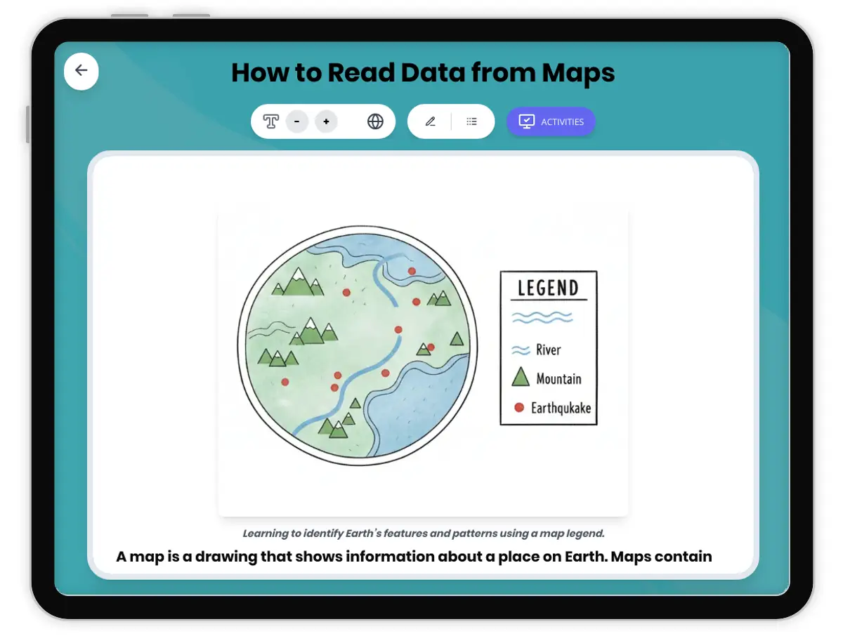 This 250-word reading passage introduces fourth-grade students to the essential skill of reading data from maps, aligned with NGSS standard 4-ESS2-2 and the Disciplinary Core Idea ESS2.B: Plate Tectonics and Large-Scale System Interactions. Students learn that maps contain valuable data and information that can be analyzed to find patterns and answer scientific questions about Earth's features. The passage explains how to use a map legend to identify features, how to observe patterns in geographic data, and how to draw conclusions from map information. Real-world examples include identifying mountain ranges, tracking river flow patterns, and locating earthquake zones. The content is presented in accessible, grade-appropriate language with bolded vocabulary terms defined in context. Students practice the core skill of analyzing and interpreting data from maps through hands-on activities including multiple-choice comprehension questions, writing prompts that require application of concepts, and graphic organizers for organizing map observations. The passage is audio-integrated for accessibility and includes a Spanish translation to support English language learners. All activities reinforce the fundamental understanding that maps are scientific tools for displaying and analyzing Earth science data.