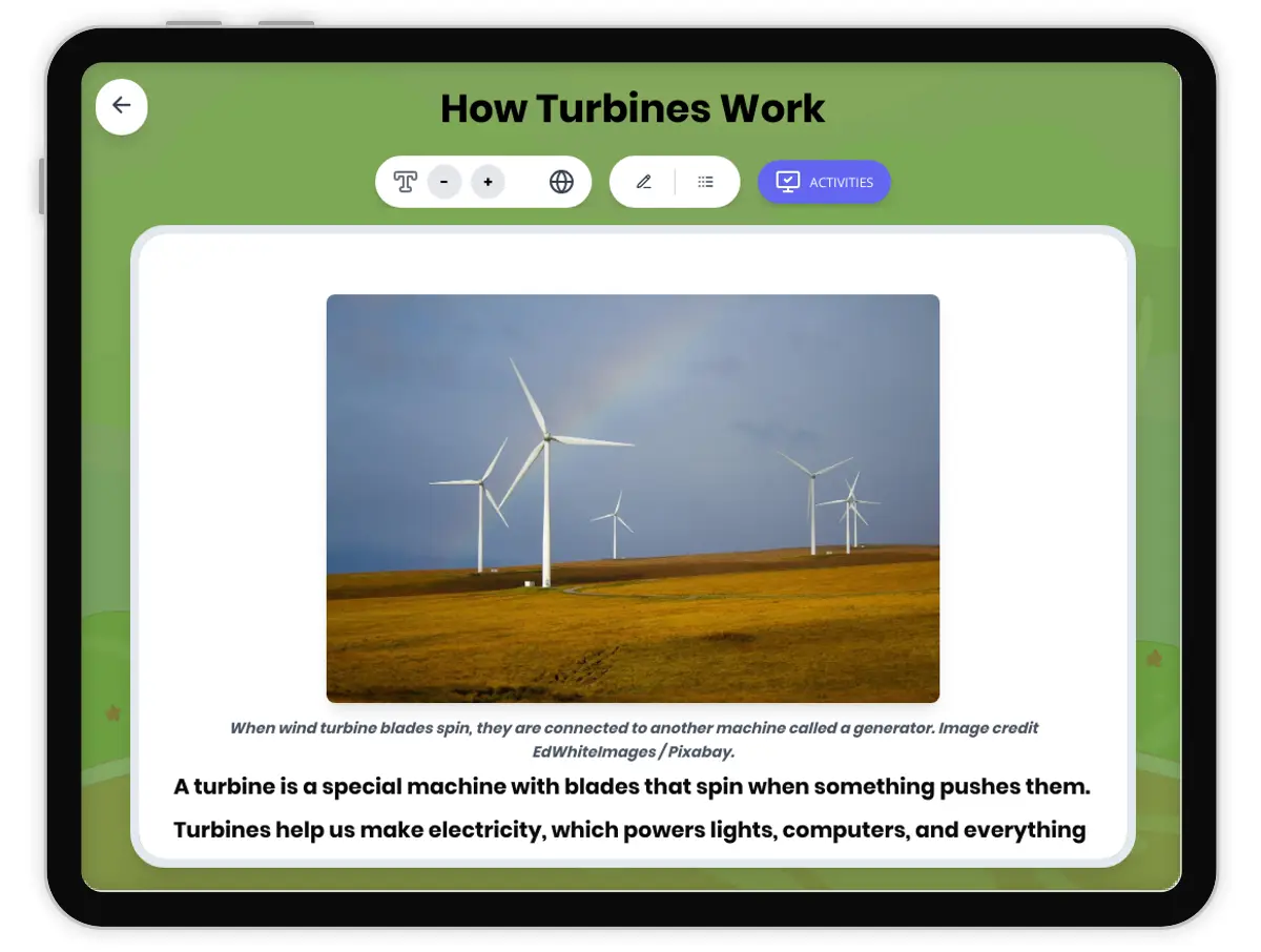 This engaging 250-word science passage explains how turbines work for Grade 4-5 students. Aligned with NGSS 4-PS3-4, the passage describes how turbines are machines with blades that spin when pushed by moving water, steam, or wind to generate power. Students learn how the spinning motion of turbines turns generators that convert motion energy into electrical energy. The passage connects to real-world applications by explaining how giant turbines in power plants spin constantly to generate the electricity that powers communities. Audio-integrated features support diverse learners. The lesson includes a simplified differentiated version, Spanish translations of both versions, a comprehensive glossary, multiple-choice questions testing recall and comprehension, writing activities requiring explanations and applications, and graphic organizers including a sequence/process table and input-process-output table. Students explore key vocabulary including turbines, spinning blades, motion energy, generators, and power generation through concrete examples and clear cause-and-effect relationships appropriate for elementary learners.