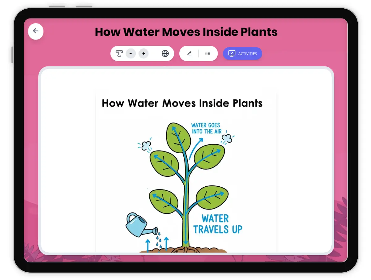 This 250-word reading passage introduces fourth-grade students to the concept of water transport in plants, aligned with NGSS 4-LS1-1 and the Disciplinary Core Idea LS1.A: Structure and Function. Students discover how plants have tiny tubes inside their stems and roots that pull water from the soil all the way up to the leaves, working like a drinking straw. The passage explains how water carries nutrients from the soil to every part of the plant, emphasizing why this internal system is essential for plant survival. Written in age-appropriate language for Grade 4 readers, the passage avoids advanced terminology like xylem and phloem, instead using simple analogies and everyday examples. The content includes audio integration for enhanced accessibility, a simplified differentiated version for struggling readers, Spanish translations of both versions, and engaging activities including multiple-choice questions, writing prompts, and graphic organizers. This comprehensive resource helps students build foundational understanding of plant internal structures and prepares them for hands-on investigations and classroom discussions about how living things meet their basic needs.