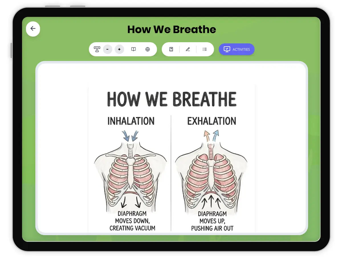This 250-word reading passage introduces fourth-grade students to the breathing process, aligned with NGSS 4-LS1-1 standards. Students explore how the chest expands and contracts during breathing, the role of lungs in exchanging gases, and why oxygen is essential for the body while carbon dioxide must be removed. The passage uses simple, age-appropriate language and real-world examples to help students understand this vital life process. Audio-integrated features support diverse learners, including English language learners and students with reading difficulties. The lesson includes a simplified differentiated version for struggling readers, Spanish translations of both passages, a comprehensive glossary of key terms, multiple-choice questions testing recall and comprehension, writing activities that encourage application of concepts, and graphic organizers that help students visualize the breathing process. This resource builds foundational understanding of respiratory system functions, preparing students for hands-on investigations and classroom discussions about how body systems work together to maintain life.