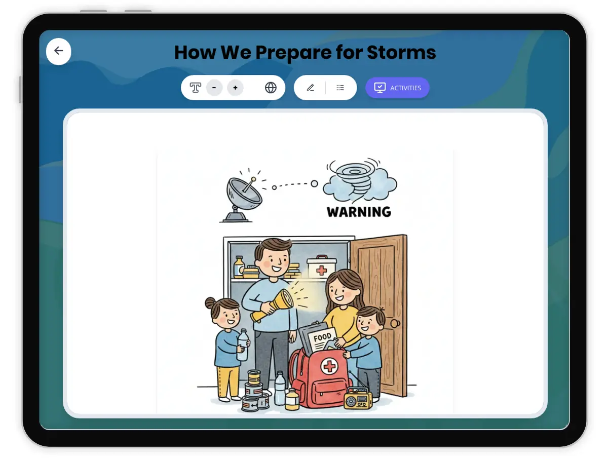 This 250-word reading passage teaches fourth-grade students about storm preparation and severe weather safety, aligned to NGSS standard 4-ESS3-2 (ESS3.B: Natural Hazards). Students learn how weather forecasters track storms and issue warnings, how families prepare emergency kits, and the different safety measures used in hurricane and tornado zones. The passage explains evacuation procedures, safe room identification, and the importance of storm drills in schools and workplaces. Written at a Grade 4 reading level, this educational resource uses simple sentences and everyday vocabulary to build foundational understanding of how communities reduce the impacts of natural hazards. The passage includes bolded key terms with immediate definitions, real-world examples, and an interesting fact about storm preparation. Audio-integrated for accessibility, this science reading passage helps students understand that preparation is one of the most effective ways to stay safe during severe weather events. Perfect for elementary science classrooms teaching about natural hazards, weather safety, and human responses to environmental challenges.