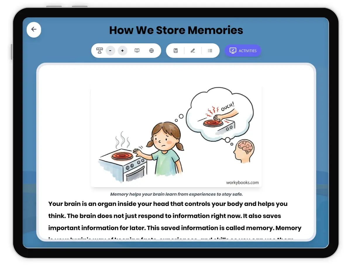 When you touch a hot stove, your brain feels the pain and stores that memory. The next time you see a stove, your brain remembers it can be hot, so you are more careful. This memory helps keep you safe. When you practice riding a bike, your brain remembers how to balance and pedal. At first, riding feels hard. But each time you practice, the memory gets stronger. Soon, you can ride without thinking about every move.