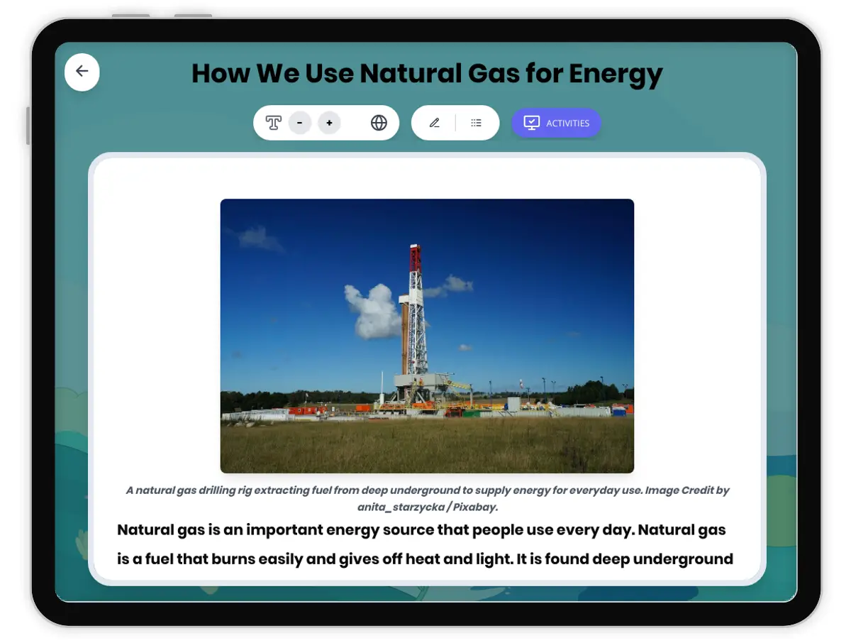 This 250-word reading passage introduces fourth-grade students to natural gas as an important energy resource. Aligned with NGSS standard 4-ESS3-1 (Earth and Human Activity), the passage explains how natural gas formed millions of years ago from tiny plants and animals, where it is found underground near oil deposits, and its three main uses: cooking food, heating homes and buildings, and generating electricity at power plants. The passage uses grade-appropriate vocabulary and concrete examples to help students understand this fossil fuel energy source. Students learn that natural gas must be brought to the surface through drilling and transported through underground pipelines. The content builds foundational knowledge about energy resources and prepares students for discussions about how humans obtain and use Earth's resources. Audio-integrated features support diverse learners, while the simplified differentiated version provides access for students reading below grade level. Companion activities include comprehension questions, writing prompts, and graphic organizers that reinforce understanding of natural gas formation, extraction, and uses in everyday life.