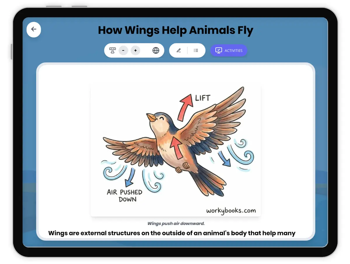 This engaging 250-word reading passage introduces fourth-grade students to the concept of wings as external structures that enable flight in various animals. Aligned with NGSS 4-LS1-1 and the Disciplinary Core Idea LS1.A, the passage explains how bird wings use feathers to push air downward and create lift, how bat wings are made of stretched skin over finger bones, and how insect wings are thin and lightweight. Students also discover that not all wings are used for flying—penguins use their wings as flippers for swimming, and ostriches use wings for balance while running. The passage uses simple, grade-appropriate language and real-world examples to build foundational understanding of animal structures and their functions. Audio integration supports diverse learners by providing multiple ways to access the content. This resource includes a simplified differentiated version, Spanish translations, glossary terms, multiple-choice questions, writing activities, and graphic organizers to support comprehensive learning and assessment of this important life science concept.