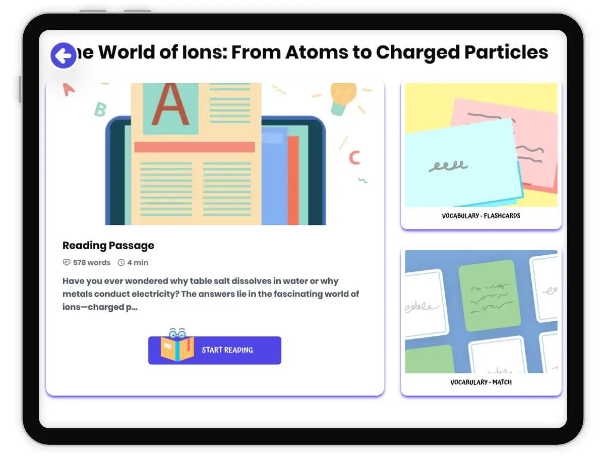 This passage introduces middle school students to the concept of ions, explaining the processes by which atoms gain or l...