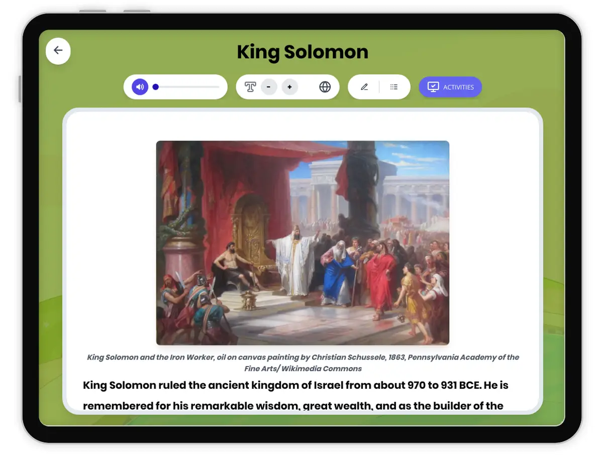 This engaging history reading passage explores King Solomon and the construction of the First Temple in ancient Jerusalem. Students will learn about Solomon’s reign, his reputation for wisdom and wealth, and the historical significance of the First Temple for the people of Israel. The passage integrates primary sources, archaeological evidence, cause-and-effect relationships, and change over time. Aligned to CA HSS 6.2 and CCSS RI.6-8.1-4, this resource supports close reading, critical thinking, and evidence-based learning. Activities include a multiple-choice quiz, explanatory writing prompts, graphic organizers, glossary, and timeline. The passage is available with read aloud audio and a full Spanish translation, making it accessible and rigorous for diverse learners studying ancient civilizations and world history.