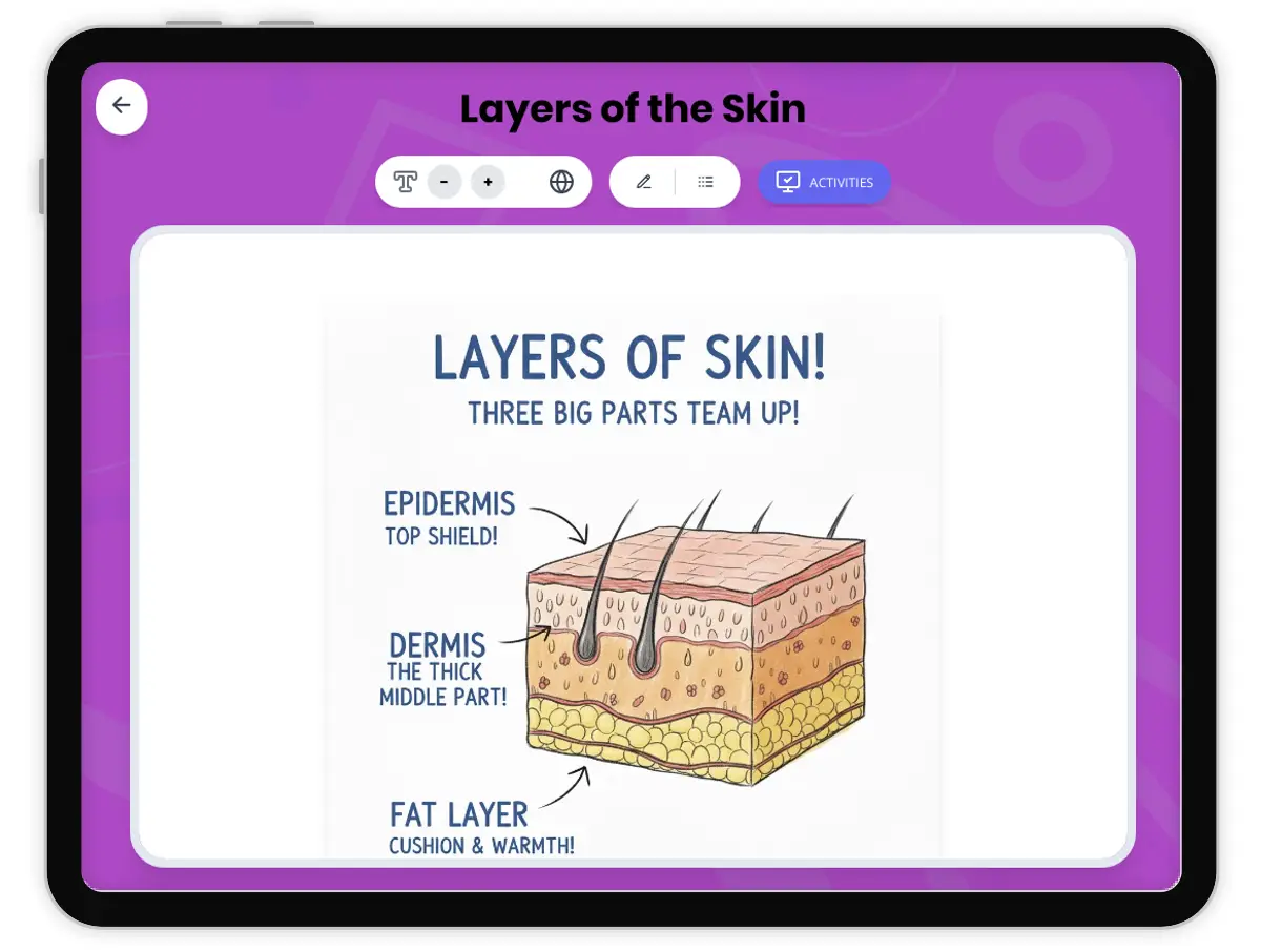 This engaging 250-word reading passage introduces fourth-grade students to the three layers of skin and their functions. Aligned with NGSS 4-LS1-1 and the Disciplinary Core Idea LS1.A, students learn that skin is the body's largest organ with distinct layers: the tough, waterproof epidermis on the outside; the dermis containing nerves, blood vessels, and sweat glands in the middle; and the subcutaneous fat layer that provides insulation and cushioning at the bottom. The passage uses simple, age-appropriate language and real-world examples to help students understand how each skin layer protects and supports the body. Audio-integrated features support diverse learners. Activities include multiple-choice comprehension questions, writing prompts that ask students to explain and apply concepts, and graphic organizers including a Structure and Function Table and a Layers Sequence Table. The Spanish translation and simplified differentiated version ensure accessibility for all learners. This resource builds foundational understanding of human body structures and prepares students for hands-on investigations about how organisms' internal and external structures support survival, growth, behavior, and reproduction.