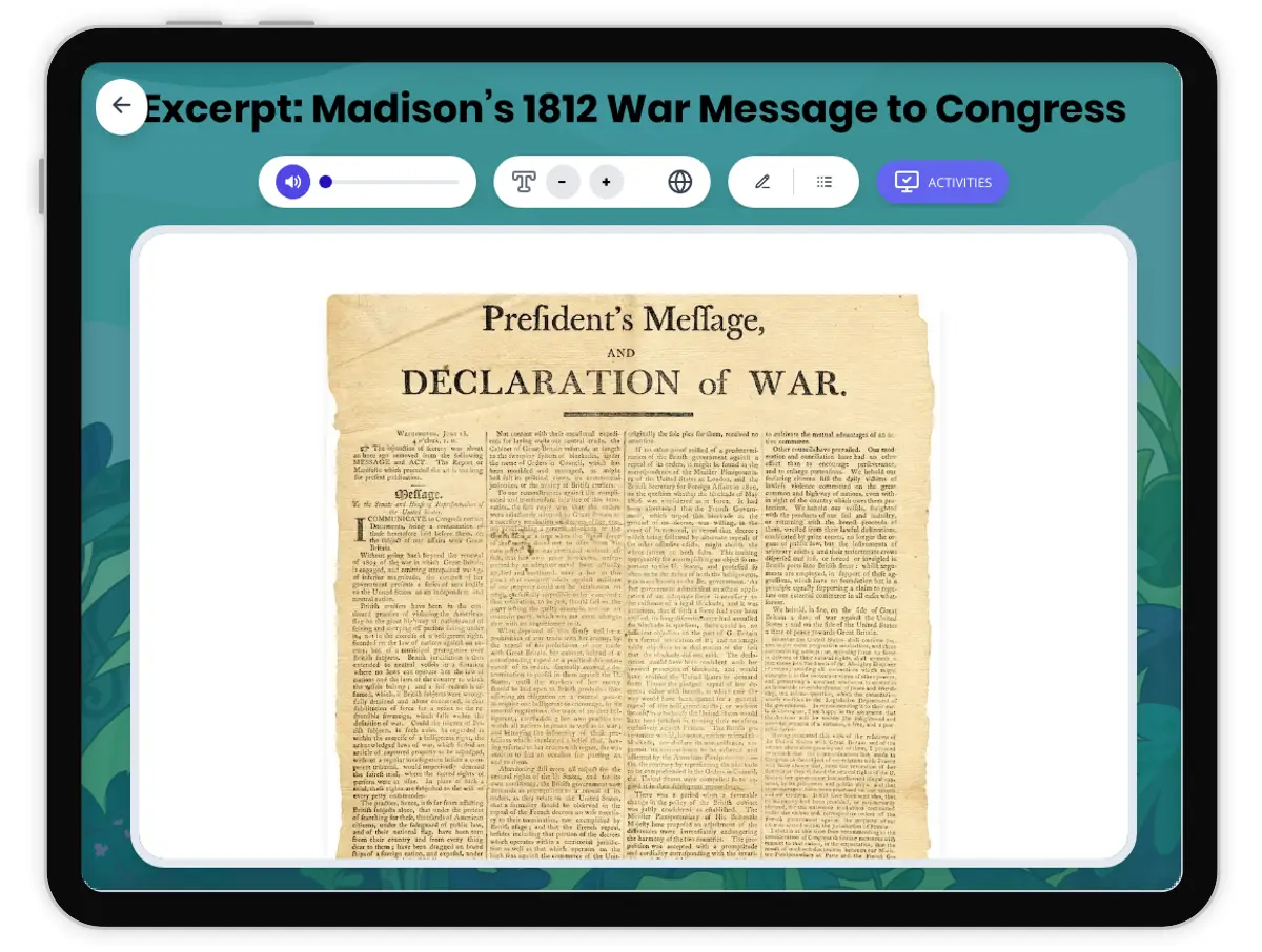 This engaging reading passage explores President James Madison’s 1812 war message to Congress, which played a pivotal role in the events leading to the War of 1812. The text details the major grievances Madison cited, such as British interference with American trade and the impressment of U.S. sailors, providing students with a nuanced understanding of the causes and consequences of the war. Designed for middle school learners, the passage incorporates academic vocabulary, encourages historical reasoning, and models the use of evidence in analyzing primary sources. This resource aligns with HSS 8.5.1 and CCSS.RI.6-8.1, RI.6-8.2, supporting both history and ELA standards. The set includes a Spanish translation, differentiated versions for accessibility, a glossary, timeline, comprehension questions, writing prompts, and graphic organizers. Read aloud audio is available, making this a comprehensive tool for history classrooms.