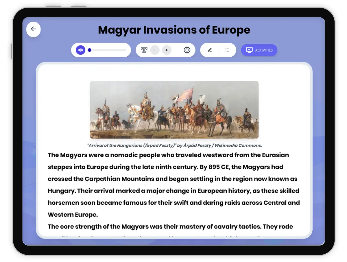 This reading passage explores the history of the Magyars, a group of skilled horsemen from the Eurasian steppes who became famous for their raids across Europe during the Middle Ages. Students will learn about the Magyars' origins, their military tactics, the impact of their raids on European kingdoms, and how they eventually settled in the Carpathian Basin, forming the foundation of modern Hungary. The passage incorporates key academic vocabulary and connects historical events to geography, social changes, and broader world history themes. Activities include a reading comprehension quiz, writing prompts, graphic organizers, and a clear timeline. The passage is provided in both English and Spanish, with a simplified version for differentiated instruction. This resource aligns with HSS 7.1, CCSS RI.6.1, and supports the development of historical thinking and literacy skills. Audio read-aloud support is available for accessibility.