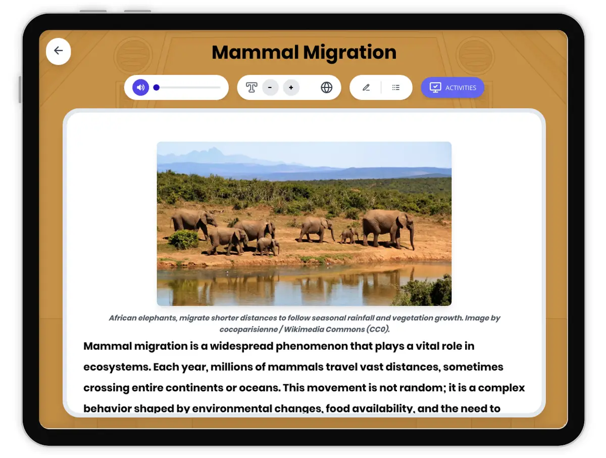 This comprehensive passage on mammal migration, designed for grades 6-8 and aligned with NGSS standards MS-LS2-2 and MS-LS1-4, delves into the underlying mechanisms and significance of migratory behavior in mammals. Students will learn why mammals migrate, how environmental cues and internal mechanisms interact, and how migration supports ecosystem balance. The passage presents multiple examples, such as caribou and whales, and connects migration to broader ecological and evolutionary principles. Activities include reading comprehension, vocabulary, writing prompts, and graphic organizers to reinforce understanding. Both standard and differentiated versions are available, each with a Spanish translation and audio integration. This resource supports scientific literacy, critical thinking, and cross-linguistic learning, making it ideal for diverse classrooms seeking to deepen students’ understanding of animal adaptations and environmental interactions.