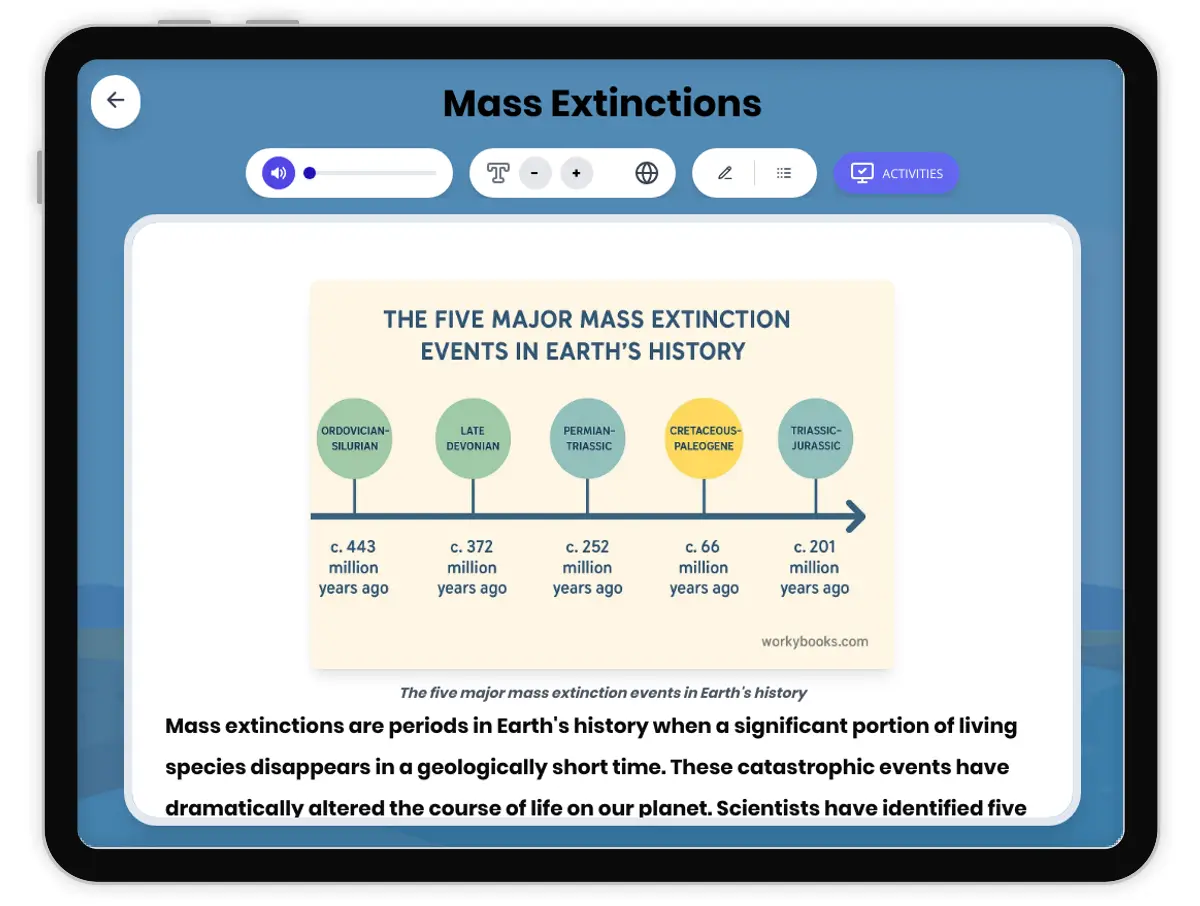 This comprehensive science passage introduces middle school students to the topic of mass extinctions, aligning with NGSS standards MS-ESS1-4 and MS-LS4-1. Students will learn what mass extinctions are, the mechanisms behind the 'Big Five' historic events, and the scientific evidence used to understand them, such as the iridium layer and fossil record gaps. The passage explains cause-and-effect relationships, including volcanic eruptions, asteroid impacts, and climate change, and discusses the long-term recovery of life on Earth. It also raises awareness about the current biodiversity crisis and human contributions to a possible sixth mass extinction. Activities include comprehension questions, writing prompts, and graphic organizers to reinforce learning. Audio integration ensures accessibility for diverse learners. This resource is ideal for building understanding of Earth's history, systems thinking, and scientific inquiry.