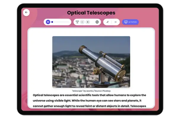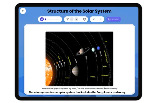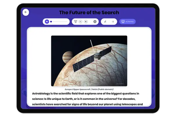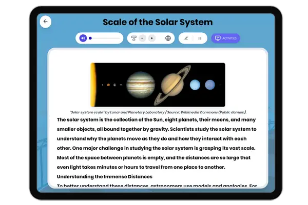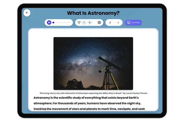 This middle school science passage explores how astronomers measure the vast distances in space, aligning with NGSS standard MS-ESS1-3. Students will learn about astronomical units, light-years, and parsecs—special units designed for the immense scales involved in astronomy. The passage explains underlying mechanisms, such as parallax, and investigates the importance of these units in understanding the structure of our solar system and the universe. Real-world examples, including the distance to Proxima Centauri and the Andromeda Galaxy, demonstrate how these measurements connect to broader scientific principles, such as looking back in time. The passage and activities integrate key vocabulary, comprehension questions, writing prompts, and graphic organizers, with audio support for accessibility. This resource is designed to build scientific literacy and reasoning for grades 6-8.