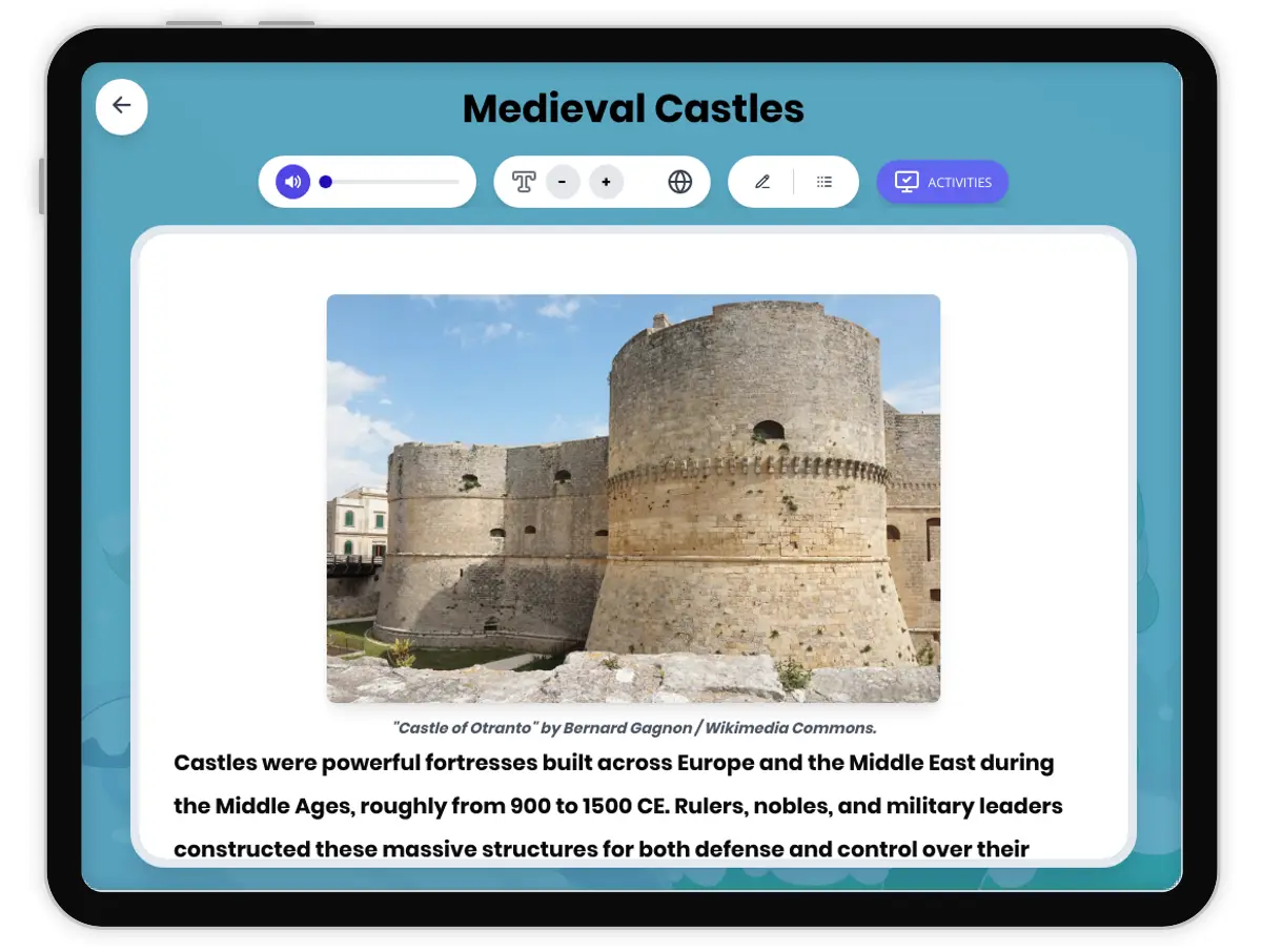 This engaging world history reading passage examines the design, purpose, and daily life within medieval castles. Students will learn how features like moats, thick walls, and towers protected people during the Middle Ages, while also exploring archaeological evidence and historical examples such as the Tower of London and Krak des Chevaliers. The passage supports critical thinking with vocabulary, timelines, and comparison of defensive tactics. Activities include comprehension quizzes, writing prompts, graphic organizers, and both English and Spanish versions, making it ideal for diverse classrooms. Aligned with CA HSS 7.2 and CCSS RH.6-8.2, this resource also includes a glossary and coloring page prompt, and provides opportunities to analyze cause and effect, continuity and change, and the broader impact of castles on European society.