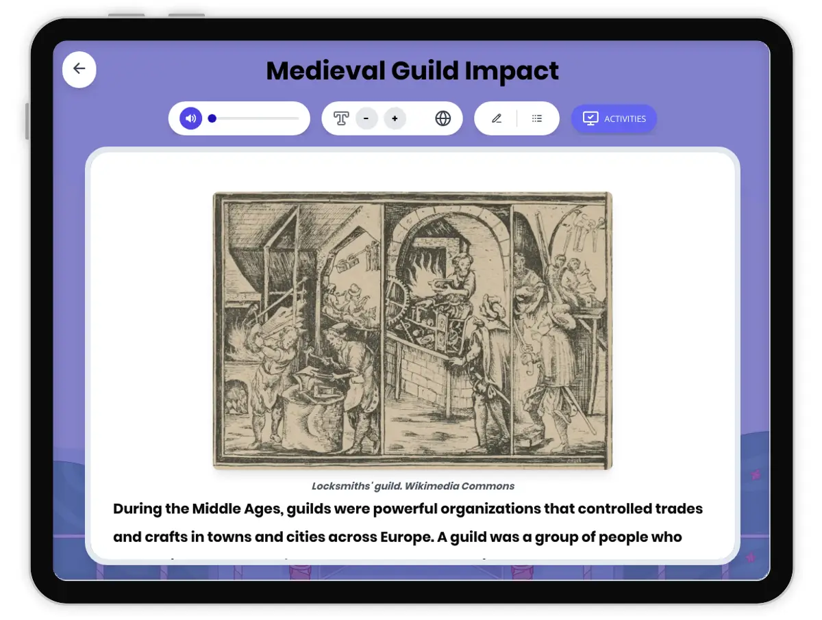 This history reading passage explores the role of medieval guilds in the Middle Ages, focusing on their control over trades, the apprentice training system, the enforcement of quality standards, and the protection of members’ interests. It provides historical context, using primary sources and archaeological evidence to explain how guilds shaped European cities and towns. Students will learn about the structure of guilds, the daily lives of craftsmen, and the broader significance of guilds in medieval society. This passage is aligned with CA HSS 7.6.3 and CCSS RH.6-8.2 and is accompanied by comprehension activities, writing prompts, graphic organizers, a glossary, a timeline, and a Spanish translation. The passage is suitable for middle school students and supports the development of historical thinking and critical reading skills, with read aloud audio provided for accessibility.