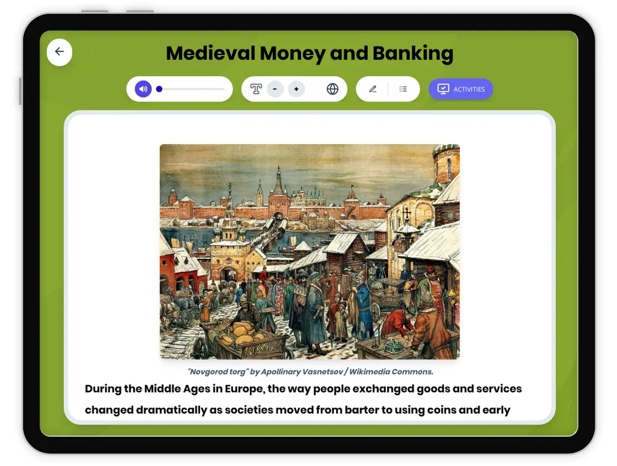 This passage explores the transformation of medieval European economies from barter to the use of coins and the development of early banking systems. Students will learn how Italian city-states such as Florence and Venice pioneered money-lending, created banking families, and helped merchants amass wealth. The text highlights the role of geography, the influence of social hierarchy, and the impact of these changes on daily life. Using examples from primary and archaeological sources, it examines the causes and effects of these developments and their significance to world history. The passage includes a glossary, graphic organizers, a timeline, reading comprehension and writing activities, and Spanish translation. The material aligns with CA HSS 7.6 and CCSS RI.6.3 standards, and is designed to help students analyze history like a historian. Read aloud audio is included.