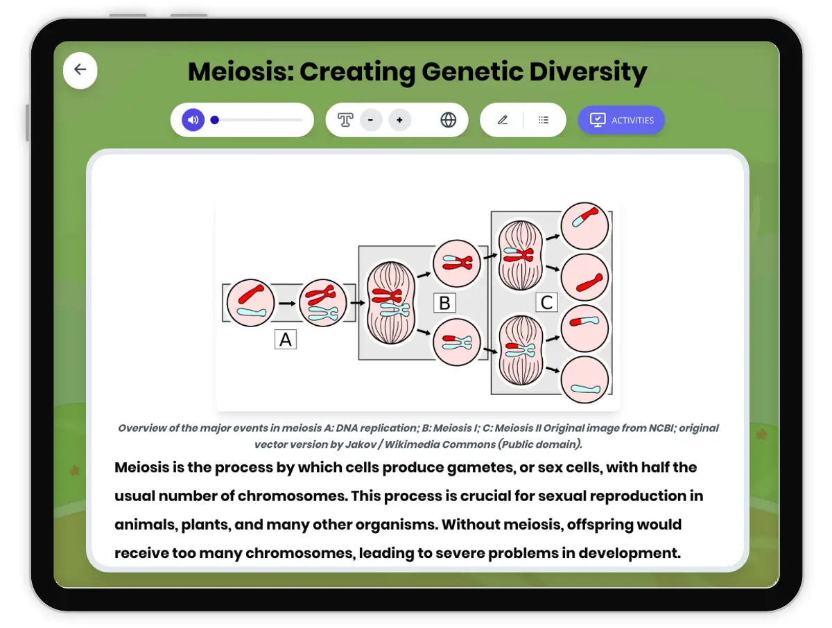 This informational passage for grades 6-8 explores meiosis, the cell division process responsible for producing gametes (sex cells) with half the usual number of chromosomes. Students will learn how meiosis differs from mitosis, the importance of genetic variation resulting from crossing over and independent assortment, and why chromosome number reduction is vital for sexual reproduction. The passage includes real-world examples, connections to Down syndrome, and integrates key disciplinary core ideas (DCIs) from the Next Generation Science Standards (MS-LS3-2). A glossary, multiple-choice quiz, writing prompts, and graphic organizers support vocabulary and comprehension. The passage is suitable for audio integration and designed to promote scientific reasoning and systems thinking. It is ideal for students building foundational knowledge about heredity, genetics, and cell biology.