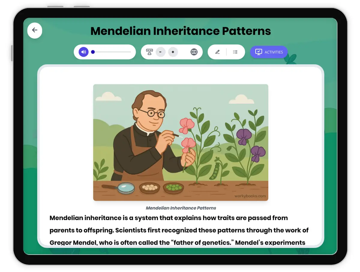 This middle school science passage explores Mendelian inheritance patterns, a fundamental concept in genetics aligned with NGSS MS-LS3-2. Students will learn about Gregor Mendel’s pioneering experiments with pea plants, the mechanisms of the Law of Segregation and the Law of Independent Assortment, and how these principles help predict how traits are inherited through generations. The passage uses accessible language and real-world examples, integrates academic vocabulary, and connects Mendel’s discoveries to broader biological and societal themes. Supporting activities include comprehension questions, writing prompts, and graphic organizers to strengthen understanding and critical thinking. Audio integration makes the content accessible to diverse learners. This resource is ideal for middle school classrooms aiming to build a strong foundation in genetics and heredity.