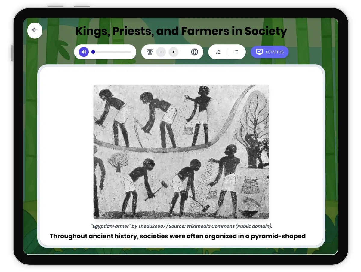 This engaging history reading passage explores the pyramid structure of ancient societies, focusing on the roles of kings, priests, and farmers. Students will learn how these groups shaped civilizations such as Mesopotamia and Egypt, including evidence from primary sources like the Stele of Hammurabi and Egyptian tomb paintings. The passage explains cause-and-effect relationships, continuity and change over time, and the impact of geography on social hierarchies. Activities include a multiple-choice quiz, writing prompts, graphic organizers, and a chronological timeline, all aligned with CA HSS 6.2.2 and CCSS RI.6.3 standards. Read aloud audio and a full Spanish translation are included to support diverse learners. This resource helps students think like historians and develop critical reading skills while deepening their understanding of ancient history.