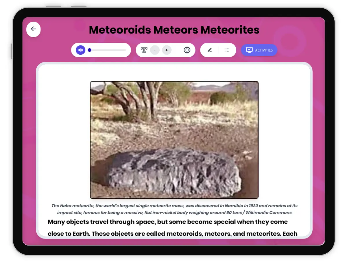 This engaging science passage helps Grade 4-5 students understand the differences between meteoroids, meteors, and meteorites. Aligned with NGSS standards, the passage defines key terms, explains scientific processes, and includes real-world examples like meteor showers and famous meteorite impacts. The content is accessible for young readers, with bolded vocabulary and a glossary for important terms. Activities include a multiple-choice quiz and writing prompts to reinforce learning and connect science to everyday life. The resource also features a Spanish translation and is audio integrated, making it suitable for diverse learners. Teachers will find this a valuable addition to lessons on space, Earth science, and astronomy.