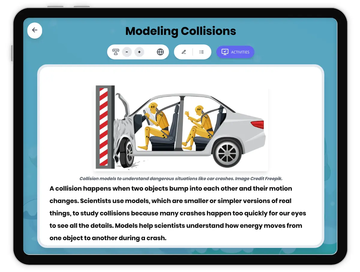 This engaging 250-word science passage teaches Grade 4-5 students about modeling collisions and how scientists use models to understand energy transfer. Aligned with NGSS standard 4-PS3-3, the passage explains how collision models help us predict what happens when objects crash into each other. Students explore concrete examples using toy cars and marbles to model real-world collisions that happen too fast to observe directly. The passage includes audio integration for enhanced accessibility and engagement. Through clear explanations and relatable examples, students learn key vocabulary including collision, model, energy transfer, and predict. The content connects classroom experiments to real-world applications like understanding car crashes and designing safer vehicles. Accompanying activities include multiple-choice comprehension questions, writing prompts requiring application of concepts, and graphic organizers that help students analyze cause-and-effect relationships in collisions. This comprehensive resource supports hands-on science learning and develops critical thinking skills as students discover how models bridge the gap between simple experiments and complex real-world phenomena.