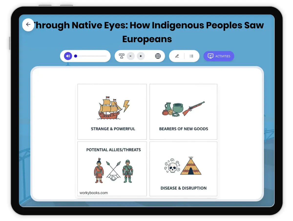 This engaging U.S. history reading passage explores how Indigenous peoples of North America saw the arrival of European explorers and settlers during Colonial America. Students will learn about key encounters, first impressions, and the changes that followed from a Native American perspective. The passage uses simple, clear language and highlights themes of bravery, unity, and problem-solving. It includes a glossary of important vocabulary, a timeline of events, comprehension questions, and a writing activity to encourage critical thinking and connections to the present. Aligned to C3 Framework and Common Core standards, this resource is designed to build historical understanding and literacy skills. The passage also features a Spanish translation and read aloud audio for accessibility. Perfect for classroom or independent study on early American history and diverse perspectives.