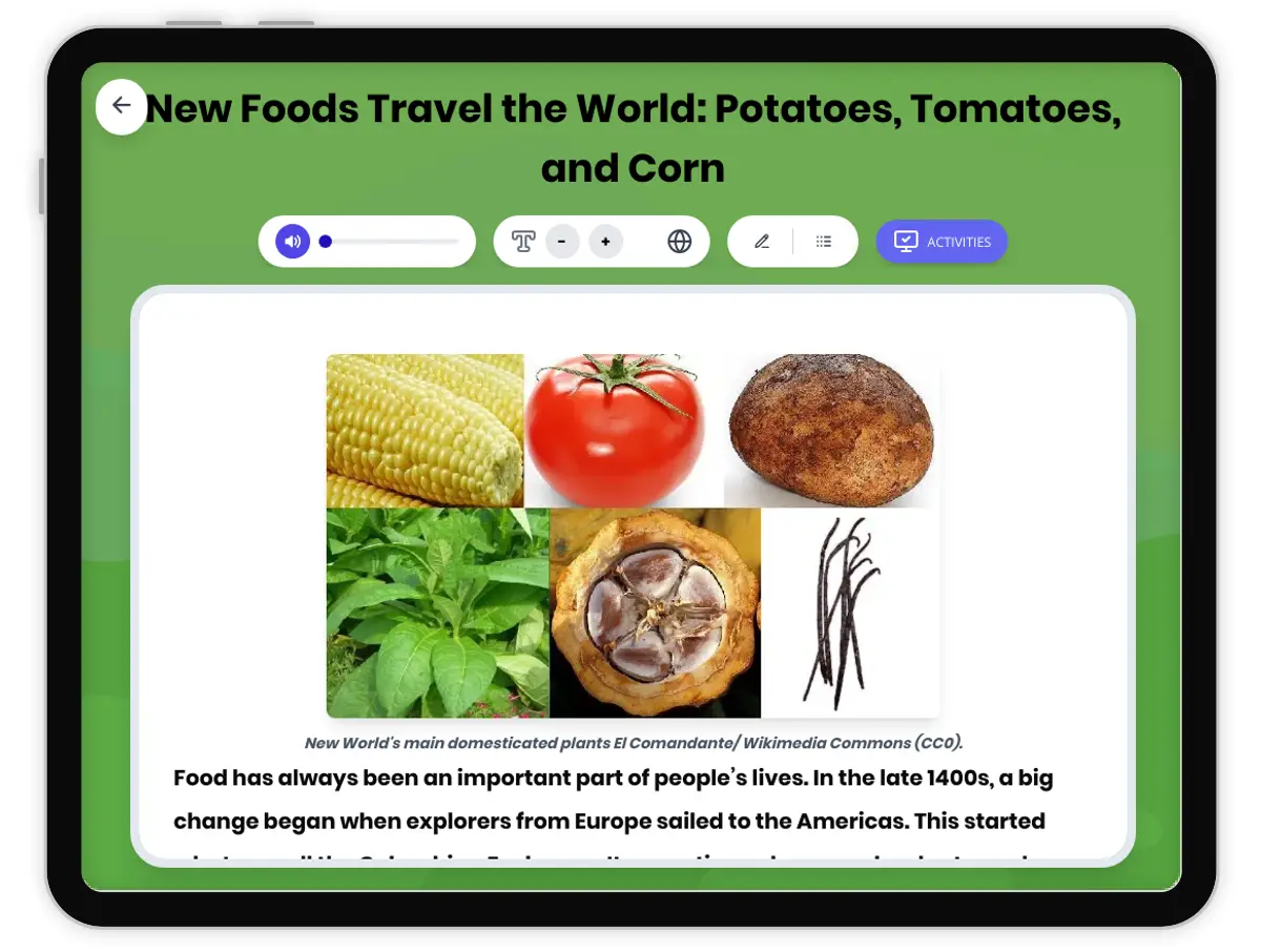 This engaging history reading passage explores the impact of the Columbian Exchange during Colonial America, focusing on how potatoes, tomatoes, and corn traveled between the Americas and Europe. Students will discover the important role these foods played in changing diets and societies around the world. The passage is designed to support foundational literacy skills and historical understanding, using grade-appropriate vocabulary and a clear cause-and-effect structure. Activities include a multiple-choice quiz, writing prompts, glossary, timeline, and graphic organizers, all aligned to C3 Framework and Common Core standards. The passage also offers a Spanish translation and read aloud audio to support all learners. This resource is ideal for building knowledge of US history, global connections, and the lasting changes brought by the Columbian Exchange. Key vocabulary words are highlighted and explained in context. Students can deepen their understanding by comparing perspectives, exploring sequences of events, and connecting past to present. Perfect for classroom or independent study.
