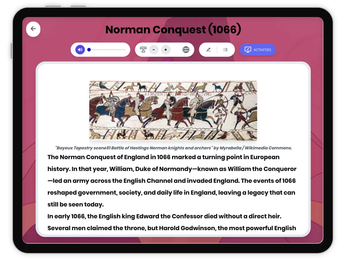 This passage explores the Norman Conquest of 1066, a pivotal event in world history when William the Conqueror led a Norman army to victory over the English at the Battle of Hastings. Designed for middle school readers, the text provides a detailed look at how the conquest transformed English society, law, culture, and language. The passage highlights major events, cause-and-effect relationships, primary source evidence such as the Bayeux Tapestry, and the impact on daily life, land ownership, and government structure. This resource supports critical thinking and analysis while aligning with HSS 7.1 and CCSS RH.6-8.2, RH.6-8.4. Additional activities, including a Spanish translation, differentiated reading, timeline, graphic organizers, and a comprehension quiz, help students deepen their understanding of medieval Europe and the legacy of the Normans. The included read aloud audio and Spanish translation make the content accessible for all learners.
