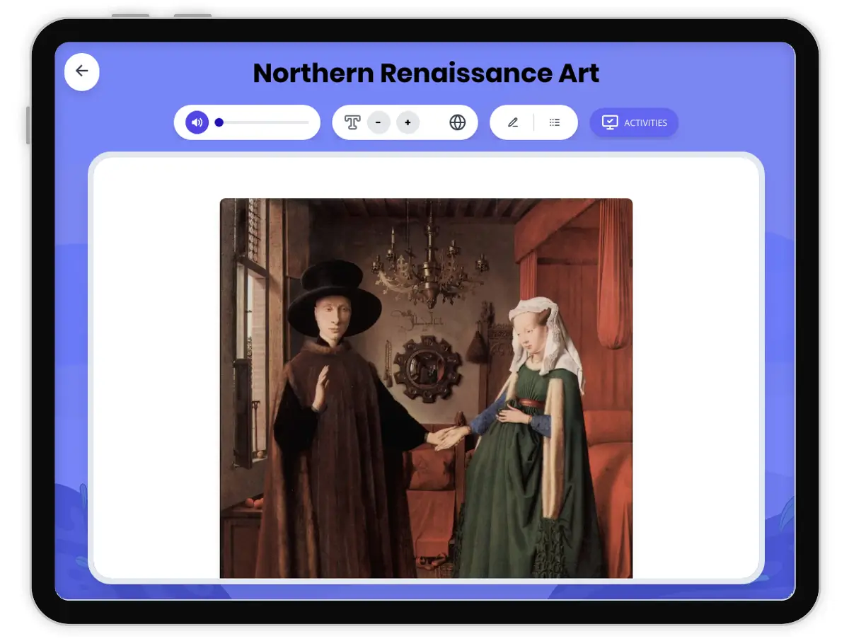 This passage examines the development and significance of Northern Renaissance art, focusing on how Renaissance ideas spread from Italy to the Netherlands, Germany, and France. Students will learn about the unique artistic styles and revolutionary oil painting techniques that emerged in these regions, as well as the impact of geography and local culture on art. Key figures such as Jan van Eyck and Albrecht Dürer are discussed, and primary source examples are included. The passage aligns with CA HSS 7.8.3 and CCSS RI.6-8.1, providing a rigorous, standards-based reading experience, with activities, a glossary, a timeline, and both English and Spanish versions. Read aloud audio is included for accessibility.