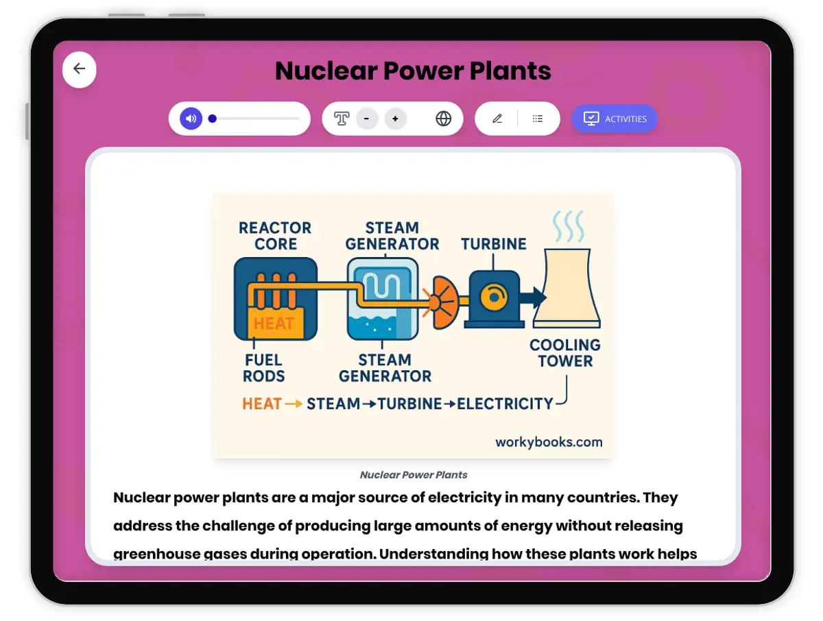 This comprehensive reading passage introduces middle school students (grades 6-8) to the science of nuclear power plants, focusing on how controlled nuclear fission generates electricity. The text explains the main components of a nuclear power plant—such as the reactor core, control rods, coolant, steam generator, and turbine—and describes their roles in the process. Students learn how nuclear plants differ from fossil fuel plants, both relying on steam turbines but using different heat sources. Key advantages, like the absence of greenhouse gas emissions during operation and high energy output, are discussed alongside challenges such as nuclear waste, safety, and costs. The passage integrates real-world examples, scientific thinking, and broader implications for society and the environment, aligning with NGSS standards MS-PS3-4 and MS-ESS3-3. Activities include quizzes, writing prompts, and graphic organizers, with audio integration for accessibility. This resource helps students build scientific literacy and critical thinking about energy systems.